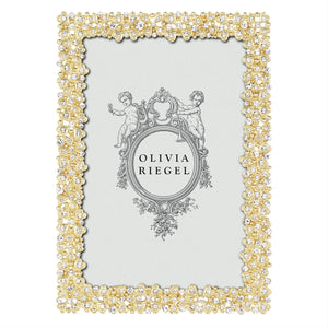 Gold finished pewter with hand-set clear European crystals. Beveled glass. Elegant champagne hued moiré silk back, with easel designed for vertical or horizontal placement.