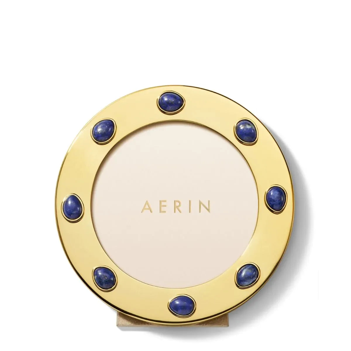 Inspired by an Art Deco brooch, this round brass frame is embellished with lapis stones, providing a classic pairing of deep blue and warm gold. It adds a luxurious touch to a vanity or desk framing a picture of a loved one and is perfect for gifting.