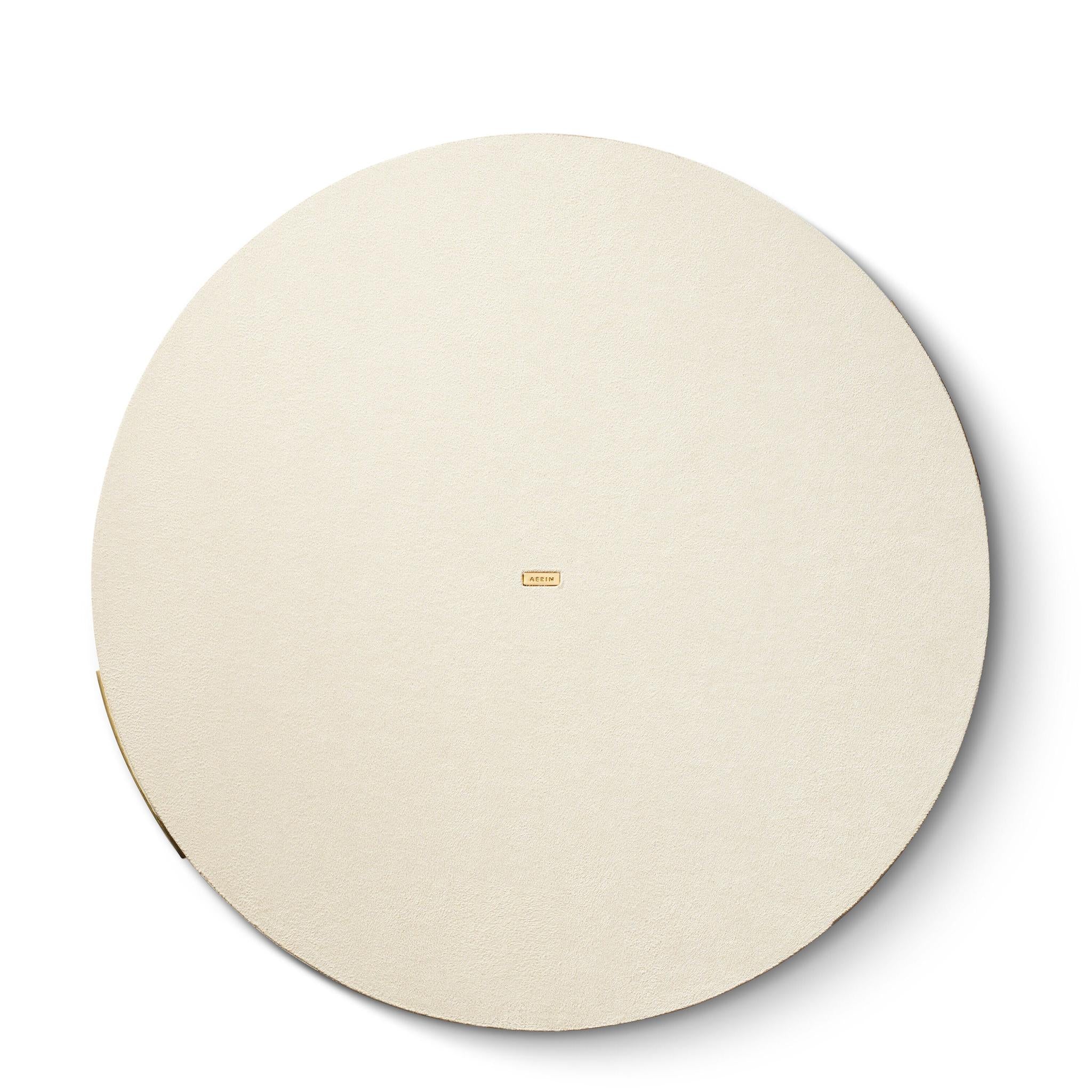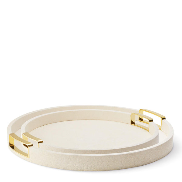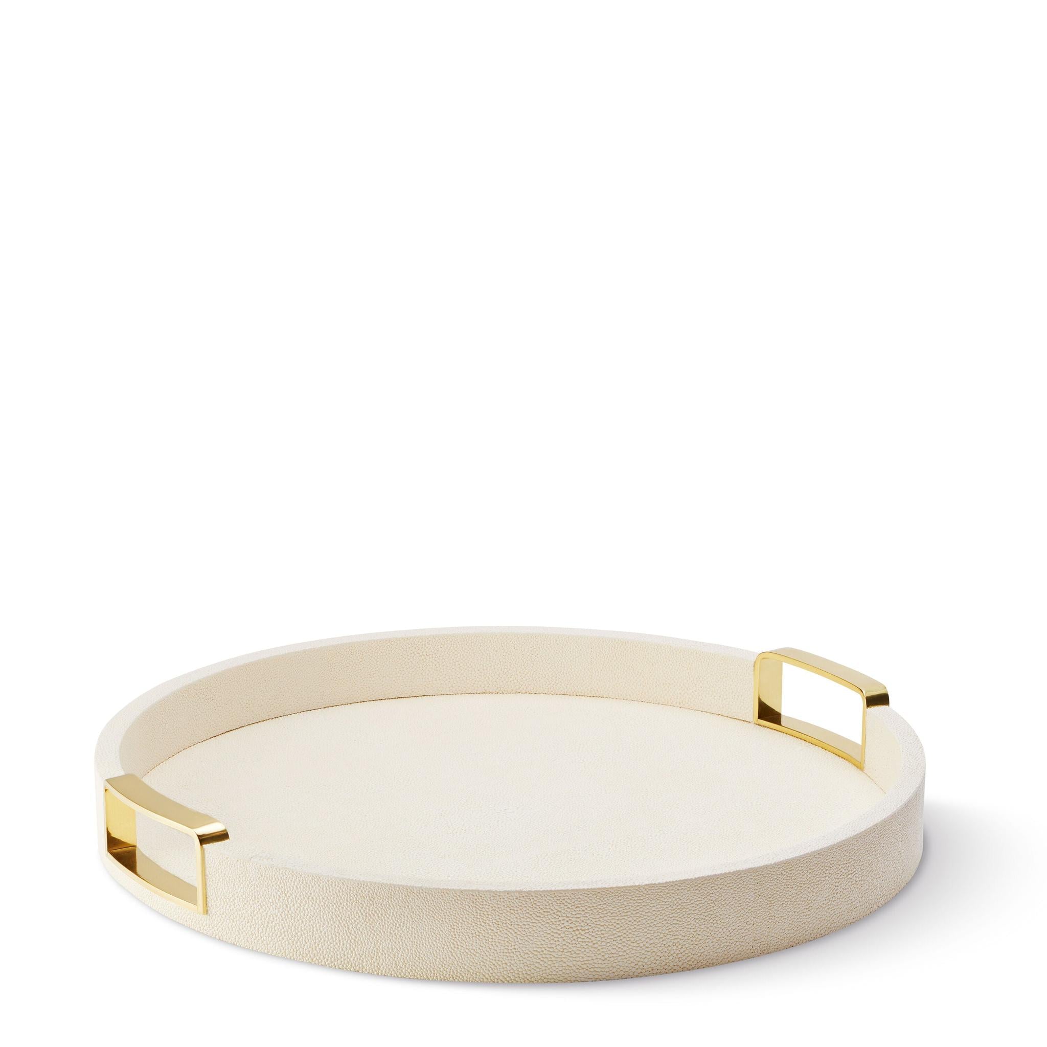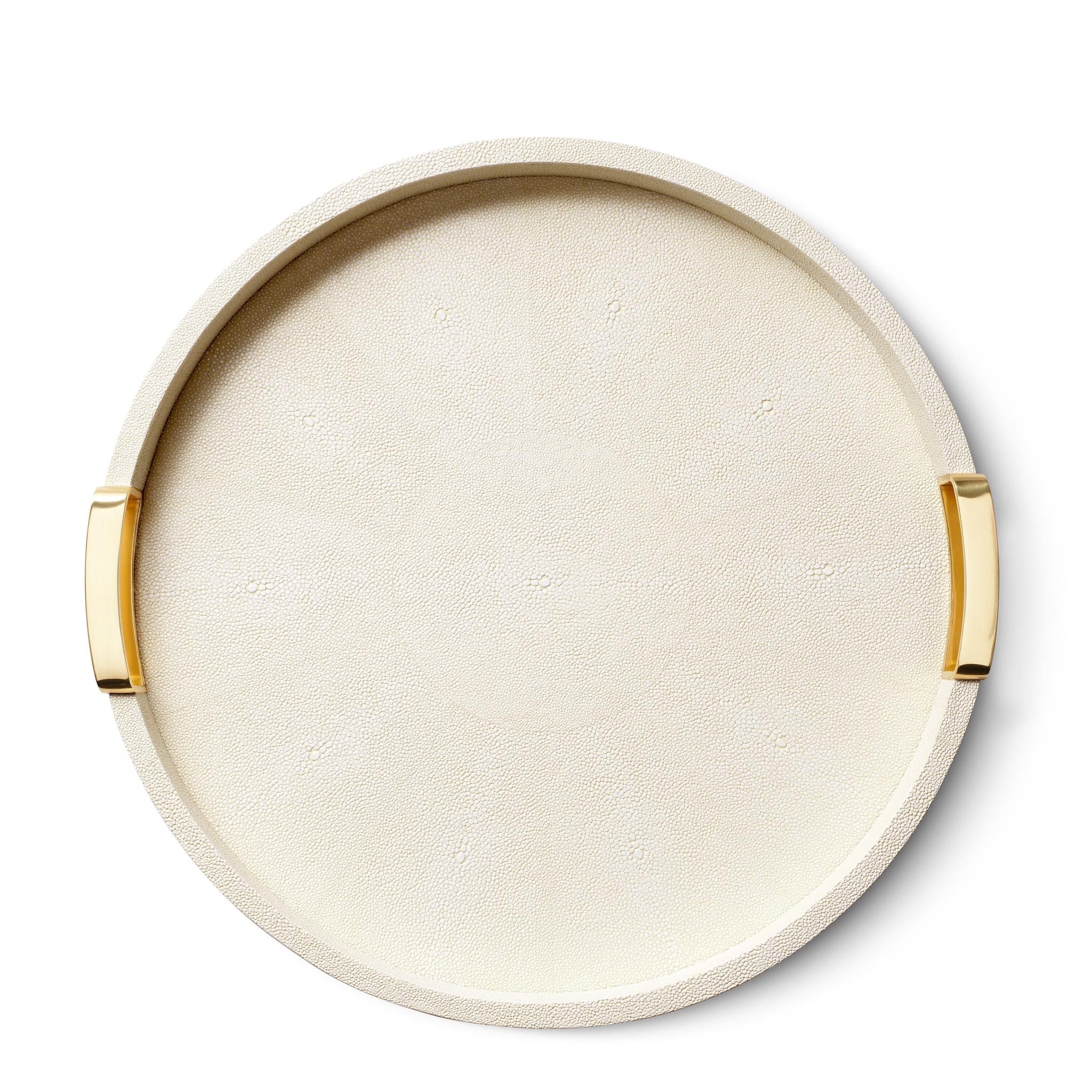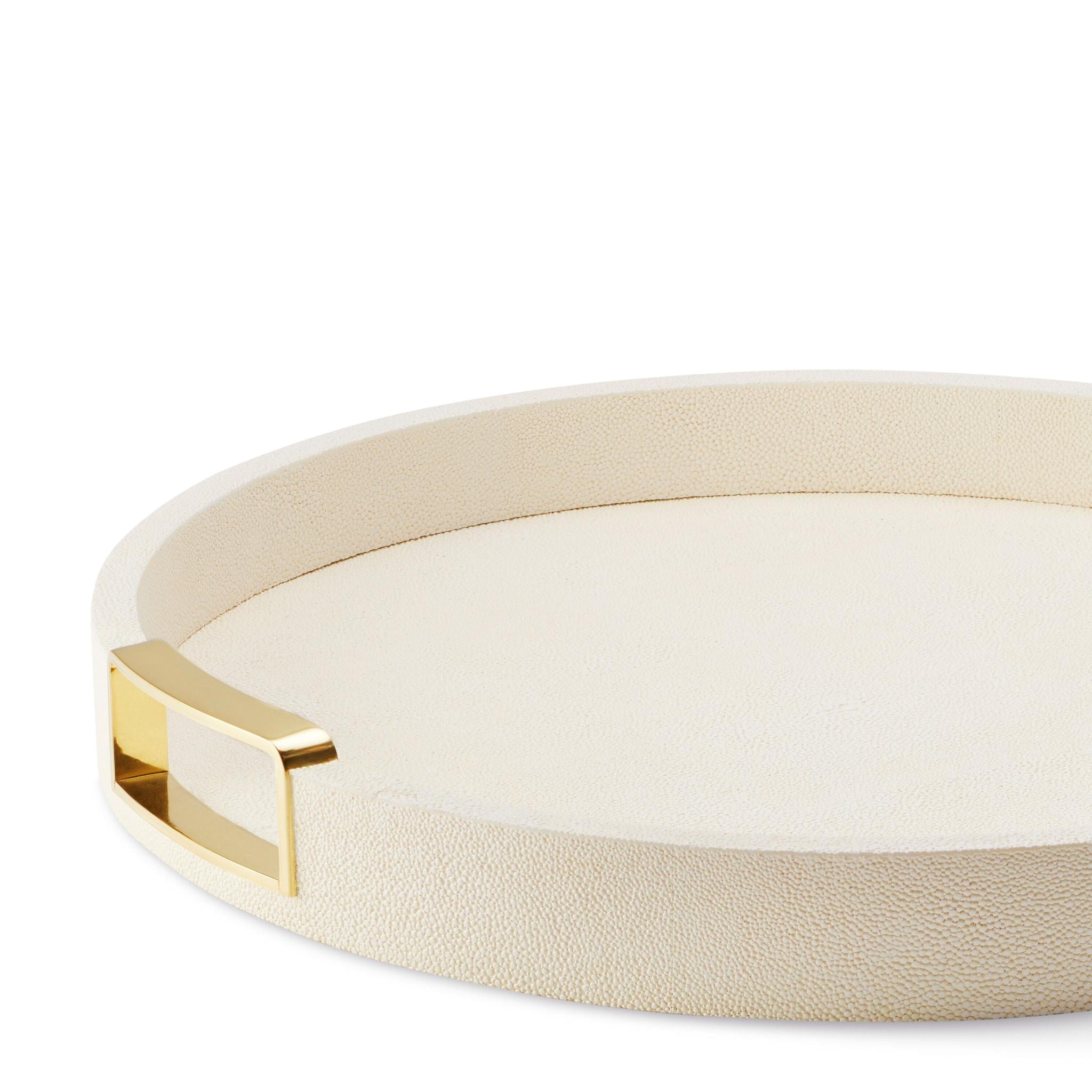 This circular tray is a stylish addition to entertaining, with an embossed shagreen finish and two rectangular integrated handles made of brass. Its compact size is perfect for carrying drinks or organizing a home bar in smaller spaces.