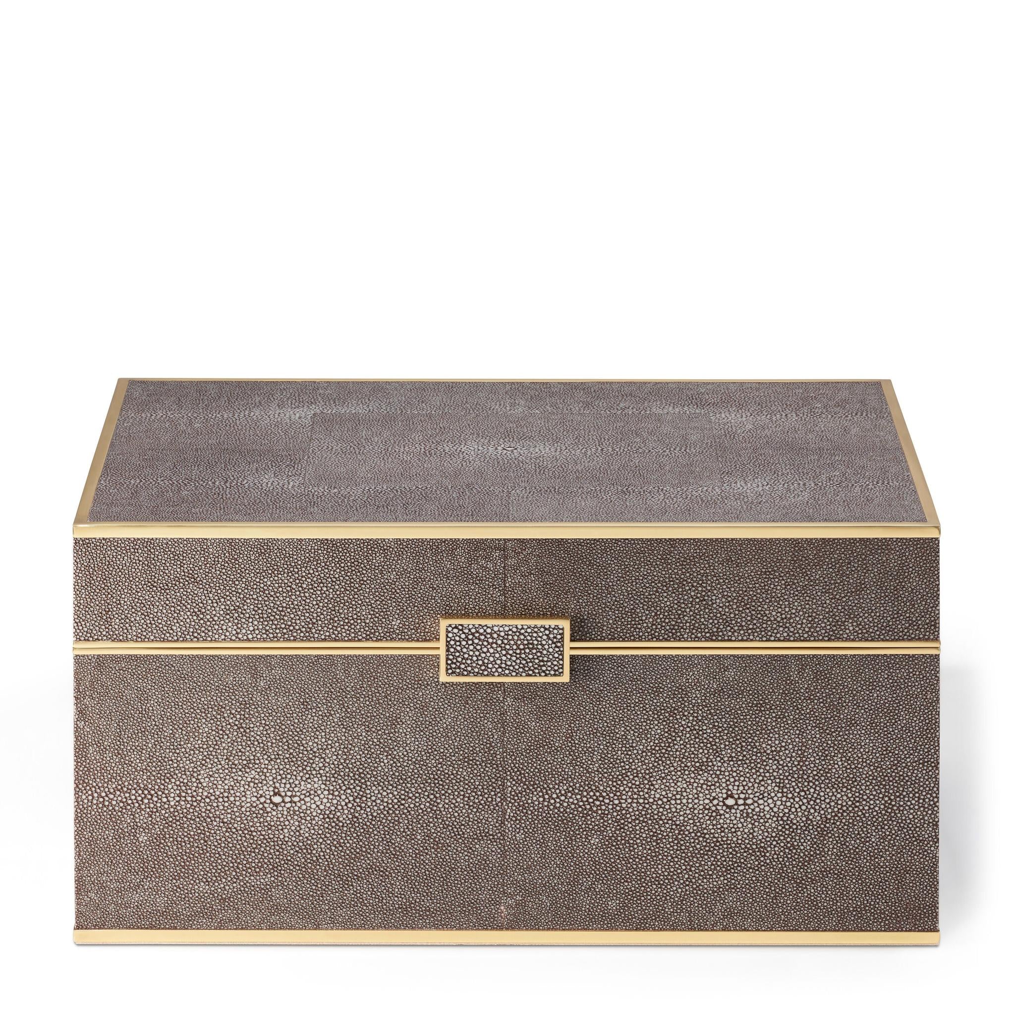 Beautifully stored in a shagreen box with brass hardware, this deluxe set has three removable trays with integrated brass handles. It includes everything you need for a home bar: a selection of Leon bar tools (bottle opener, corkscrew, bottle stopper), Fausto Jigger and Shaker Set, four Mattea Cocktail Picks, four Fausto Julep Cups, four linen napkins, and four Shagreen Coasters, all from the AERIN collection.