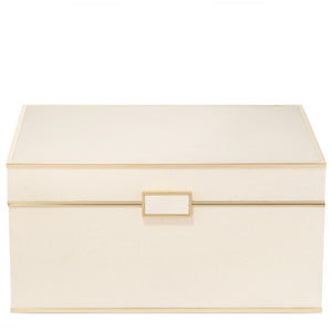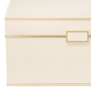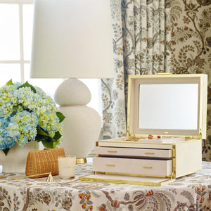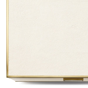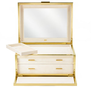 This classic jewelry box in luxurious cream shagreen edged in brass is a beautiful addition to a tabletop or vanity. A mirror within the lid is a practical addition. A top tray includes a ring holder, while the front opens to reveal two drawers, one deeper, to store jewelry and personal items.
