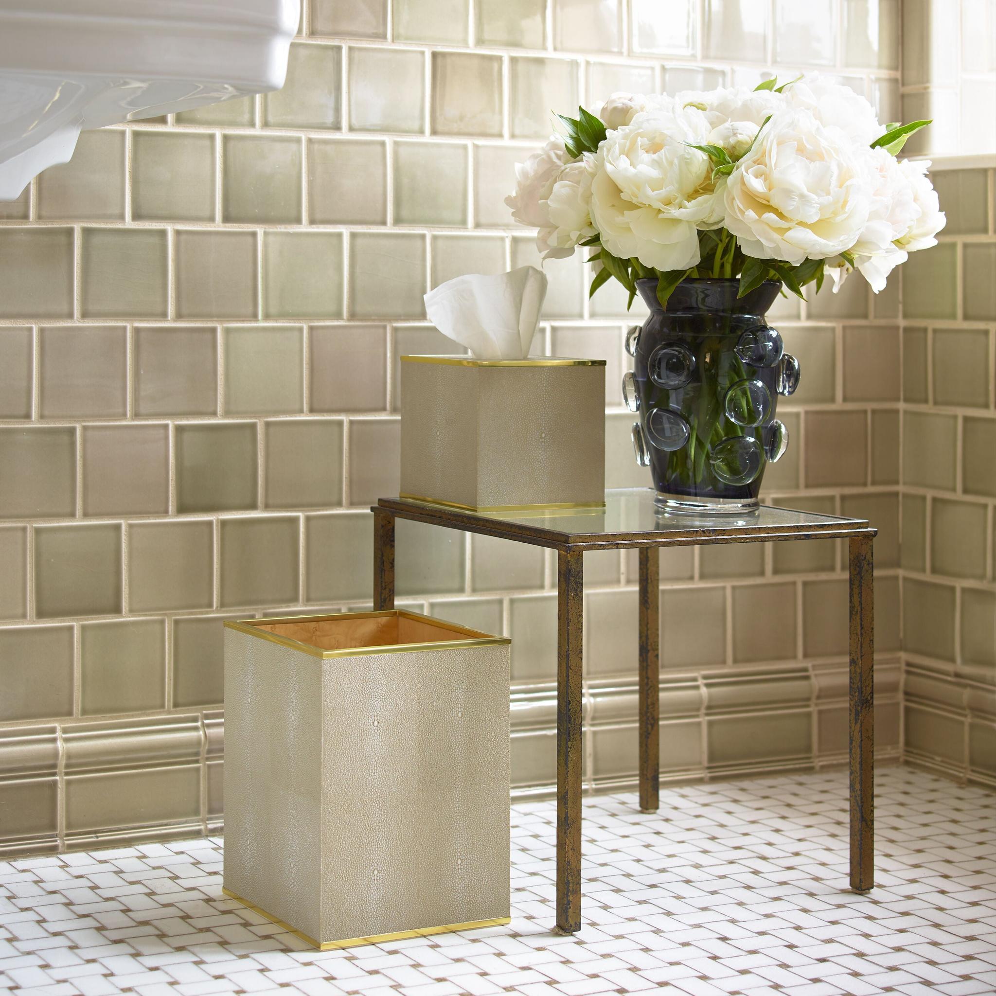 Create a clean look and organize a vanity or bathroom with this Classic Shagreen Waste Basket. The shagreen basket has an elegant look, edged with brass, with a suede lining.