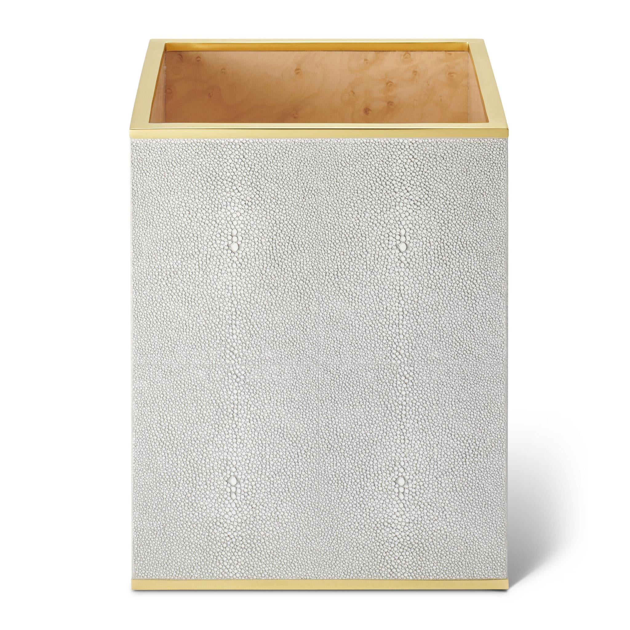 Create a clean look and organize a vanity or bathroom with this Classic Shagreen Waste Basket. The shagreen basket has an elegant look, edged with brass, with a suede lining.