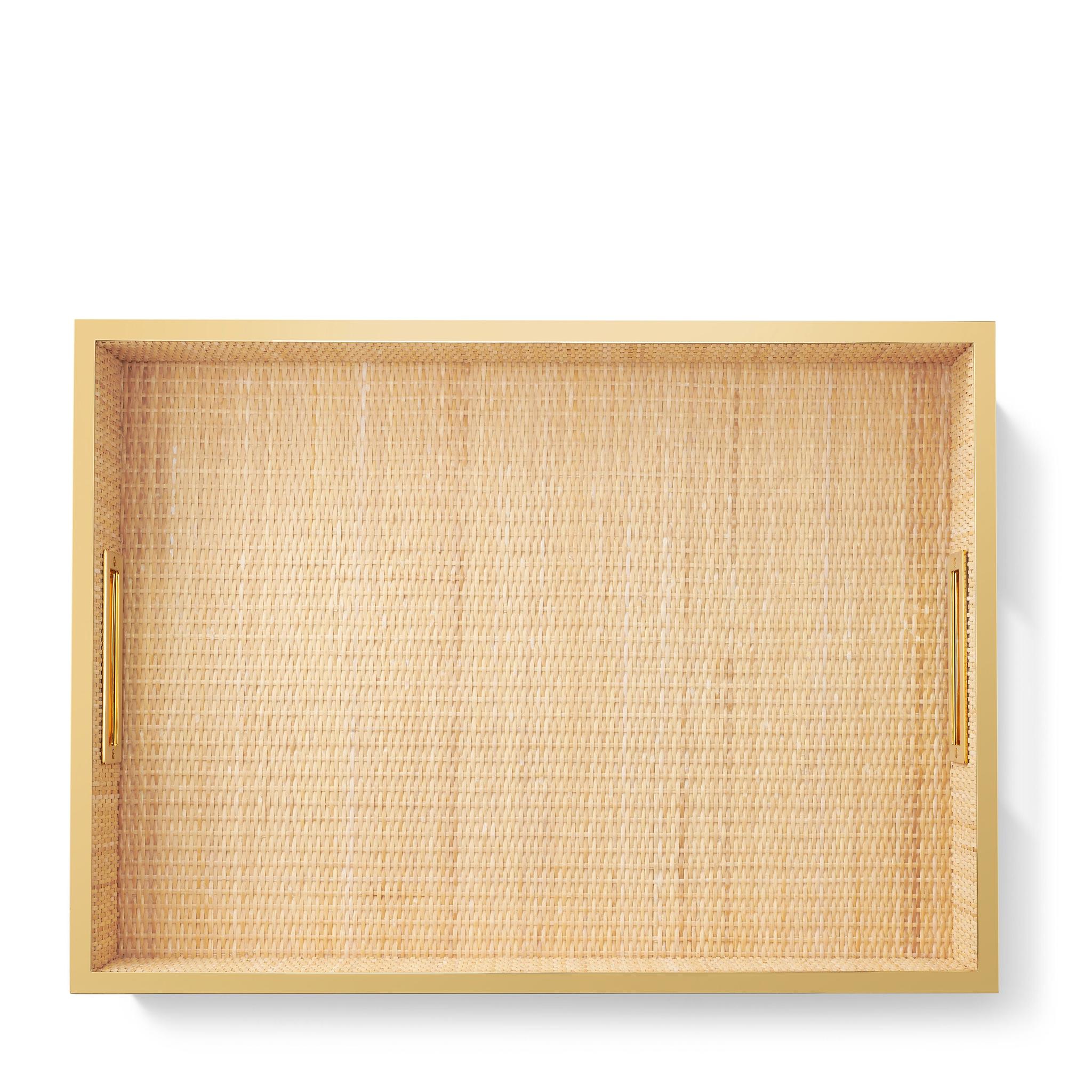 This stylish tray is crafted from woven cane edged in brass, inspired by bamboo and raffia designs from the 1970s. Integrated brass handles elevate the natural wicker to create a versatile piece suitable for formal and informal entertaining.