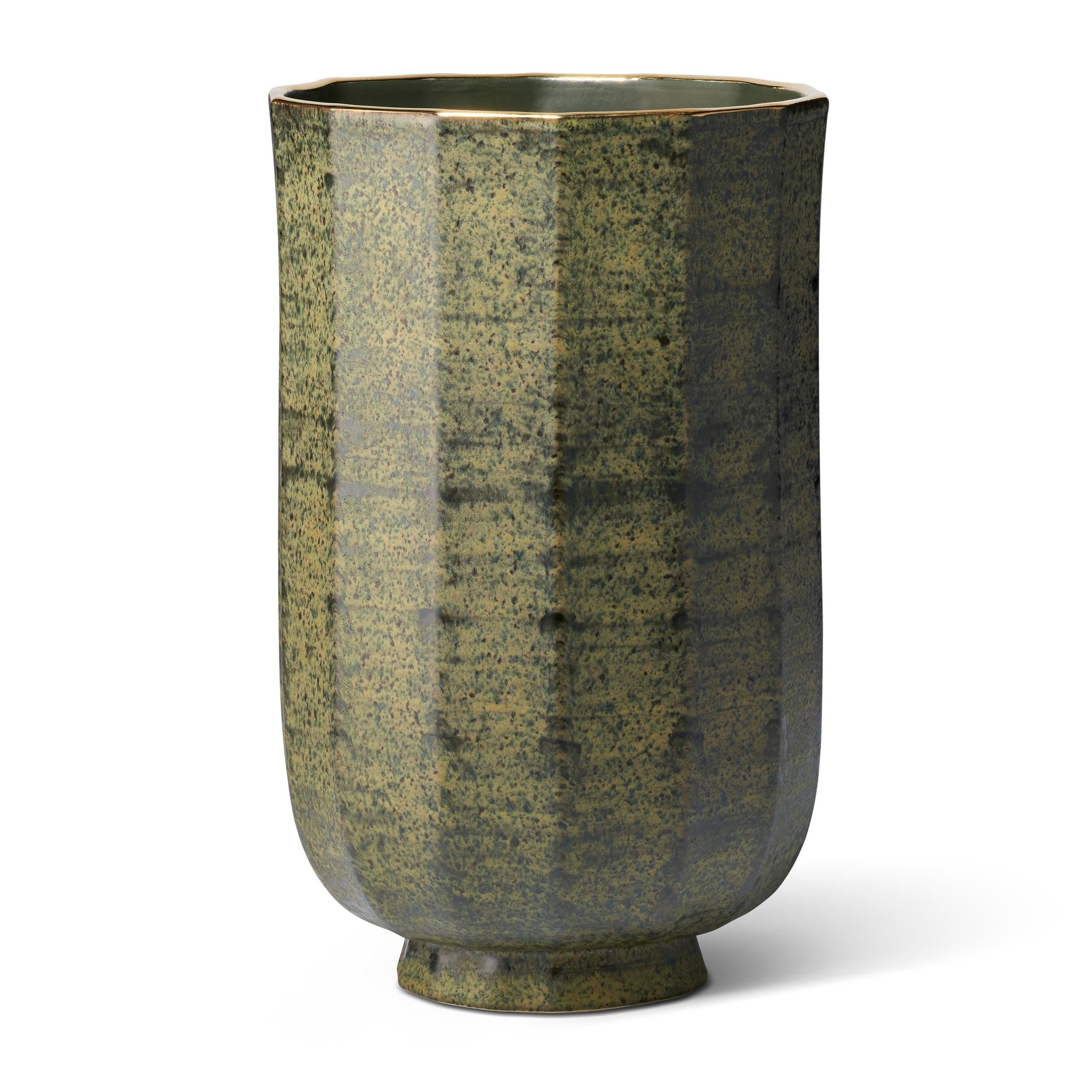 Inspired by the shapes of an Austrian Art Deco glass and a vintage lamp, the Delmara vase is a beautiful way to present long-stem flowers. This piece is slip-cast in a faceted silhouette in a hand-applied glaze with a brushed pattern that has an artisanal quality, which is further embellished with a gilded rim.