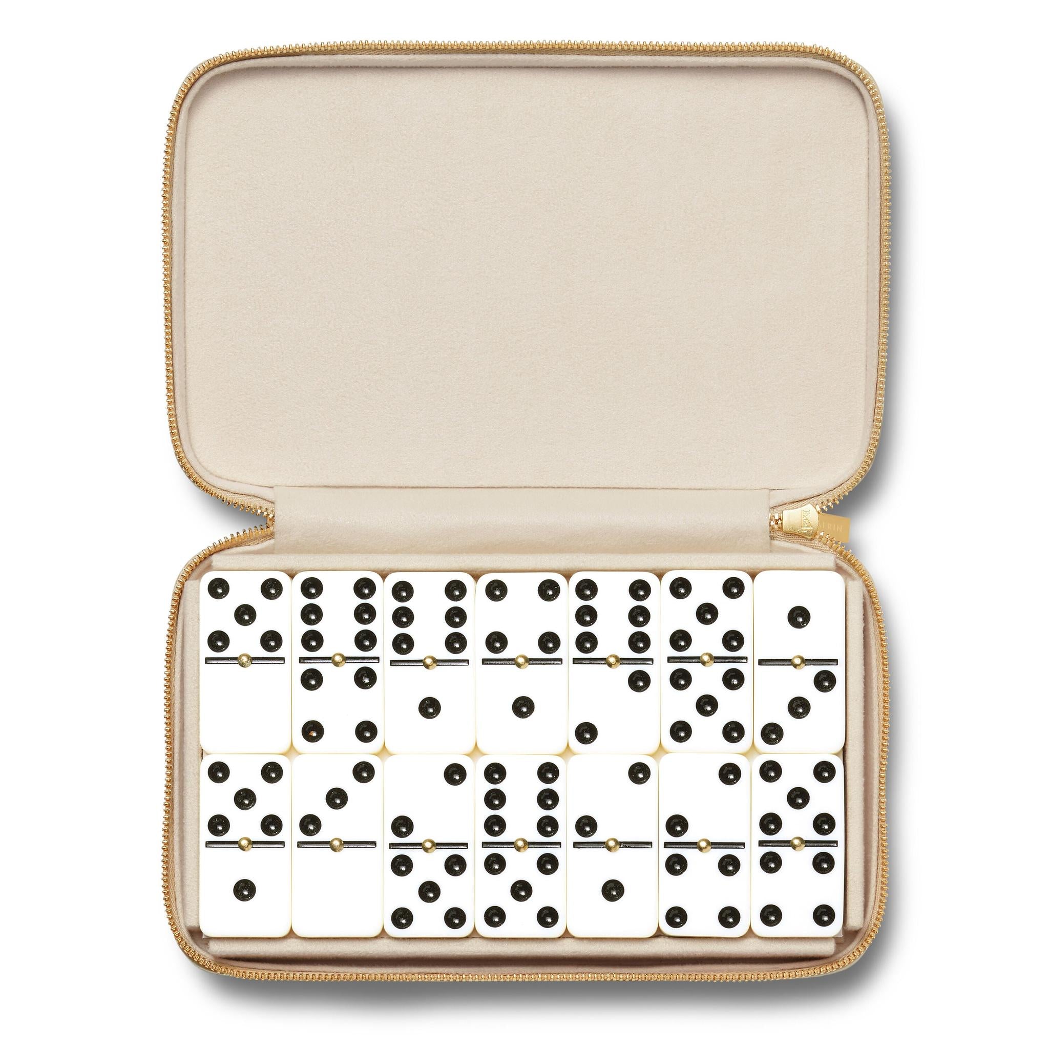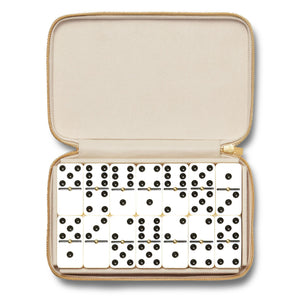 The Enzo Travel Domino Set conveniently holds a set of Double Six dominoes with brass spinners. The case, crafted in Italian Croc Embossed Leather with a zipper, is practical enough to include in a carry-on bag while traveling, but attractive enough to store on a tabletop or a bookshelf at home.