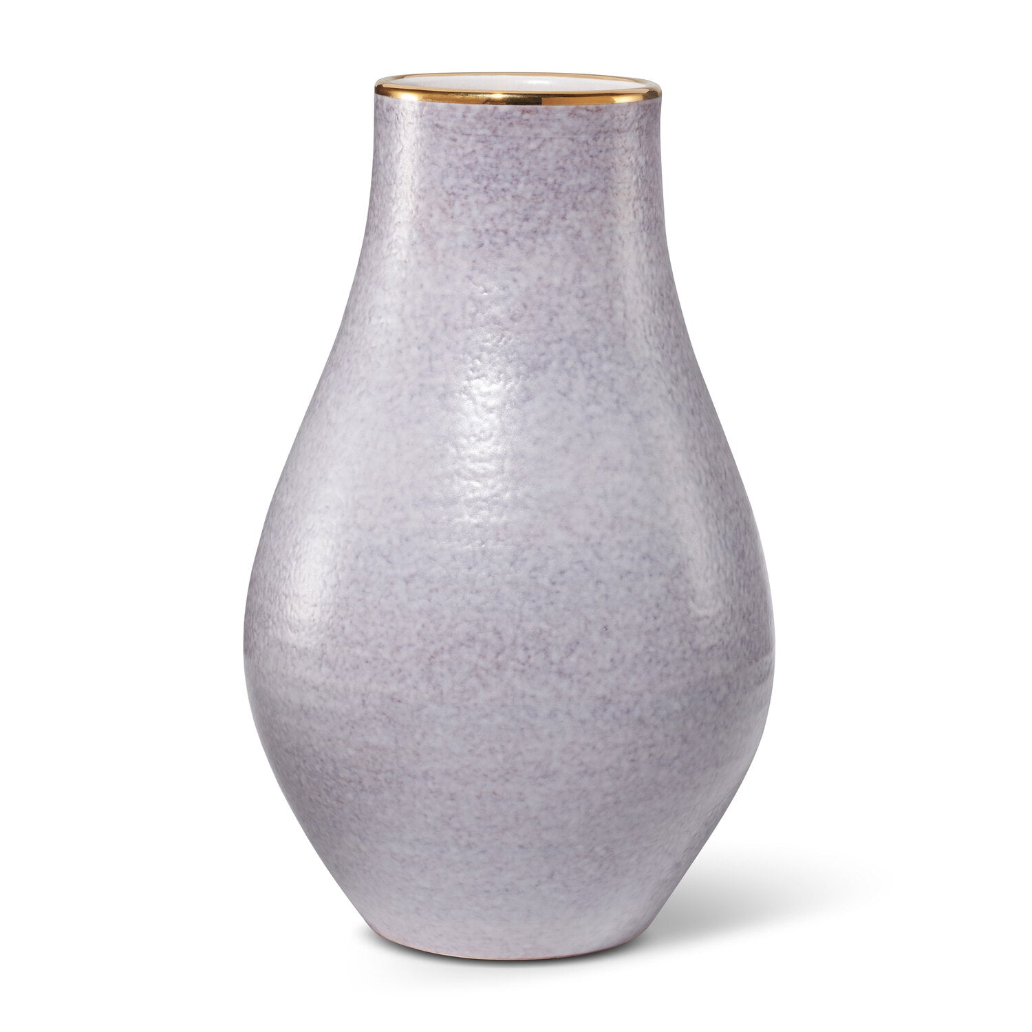 This contemporary vase has a pleasing voluminous shape that is enhanced with a gold rim and an artisanal glaze that provides depth. Subtle ribbing made by the potter's hand adds further character. The Romina's tall form is ideal for branches and is perfectly suited to a hallway console.