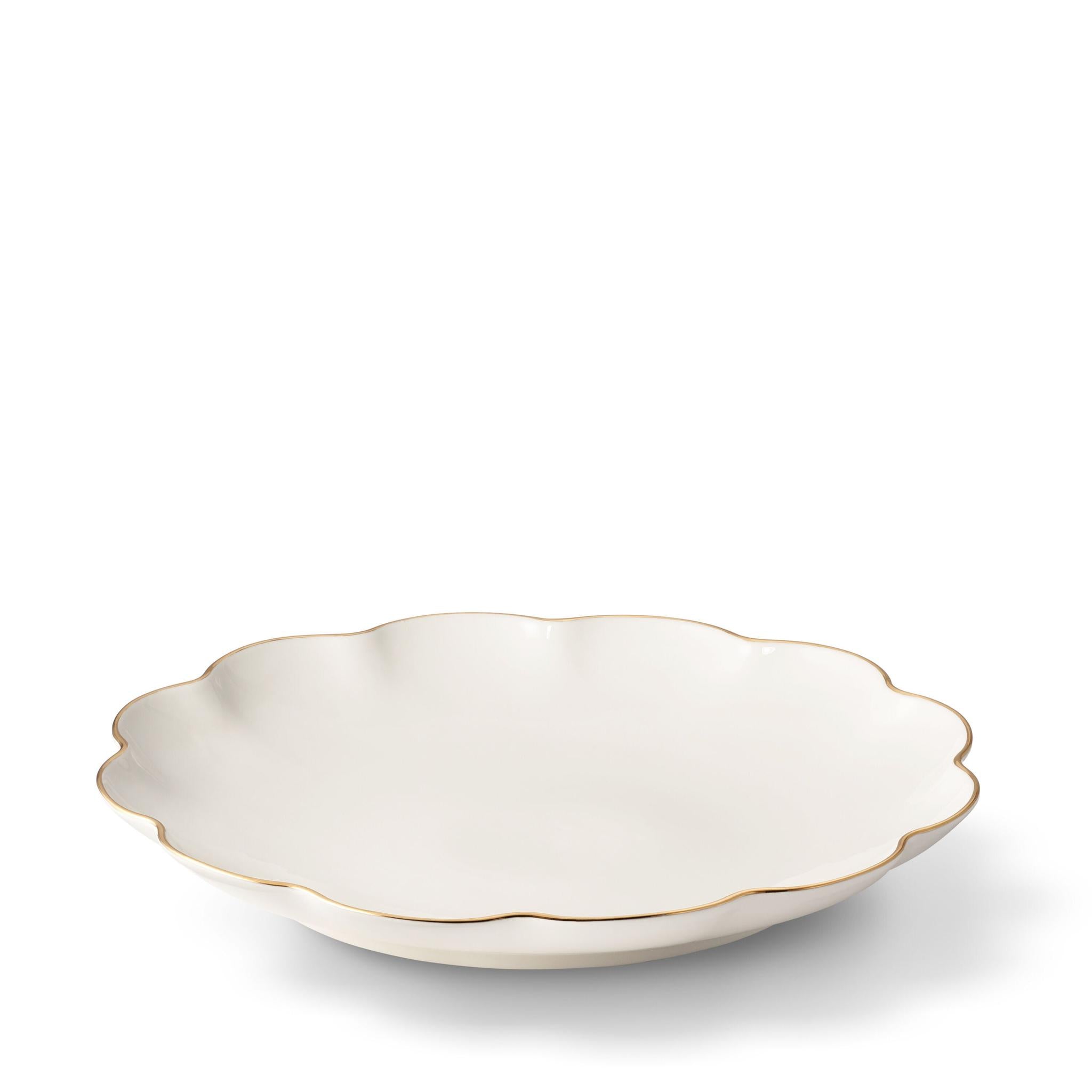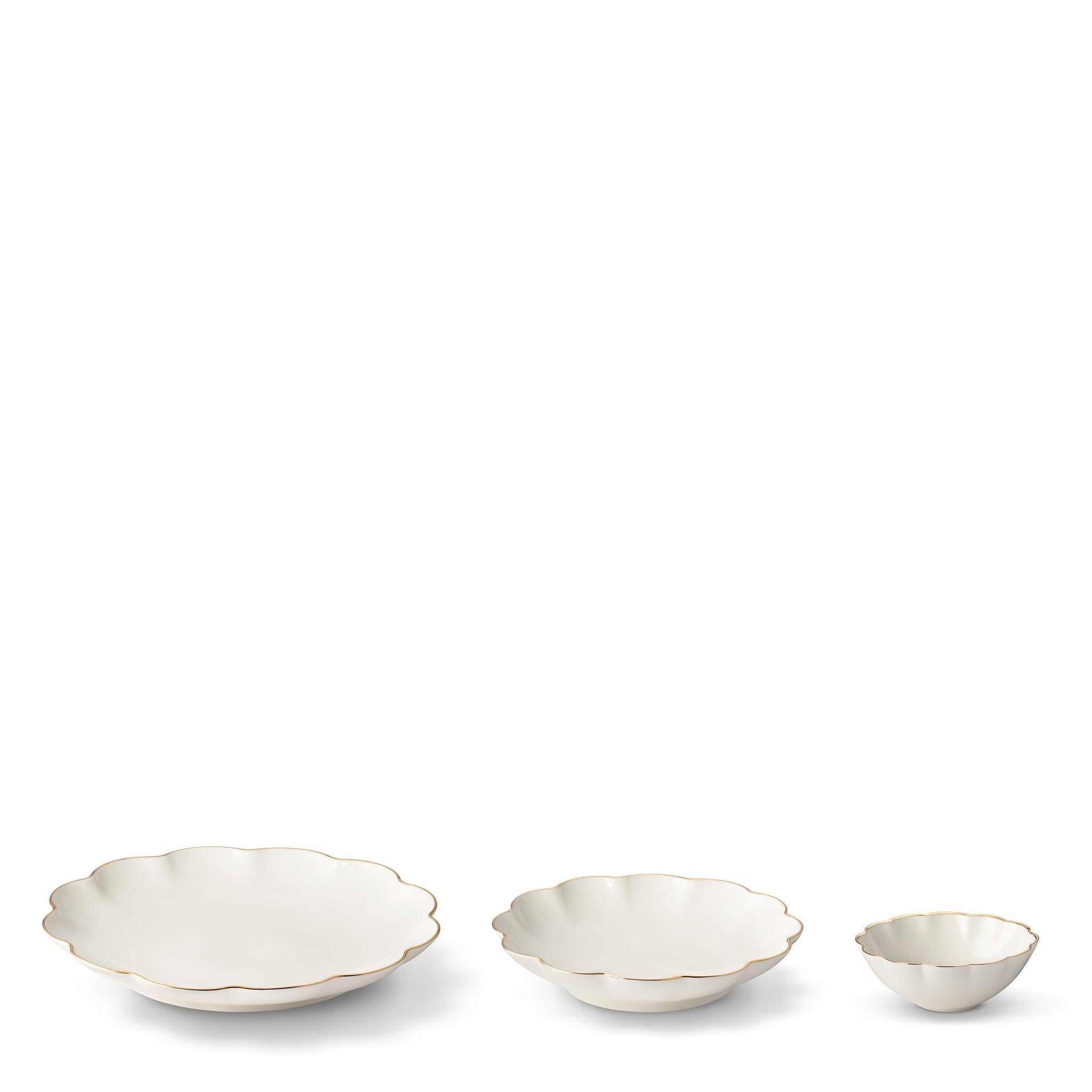 A set of three dishes—one bowl and two sizes of plate—with an elegant scalloped edge that has been further enhanced with a hand-painted gold trim. This versatile set can be used separately as serving dishes, or pair the bowl with either of the plates as a dipping option.