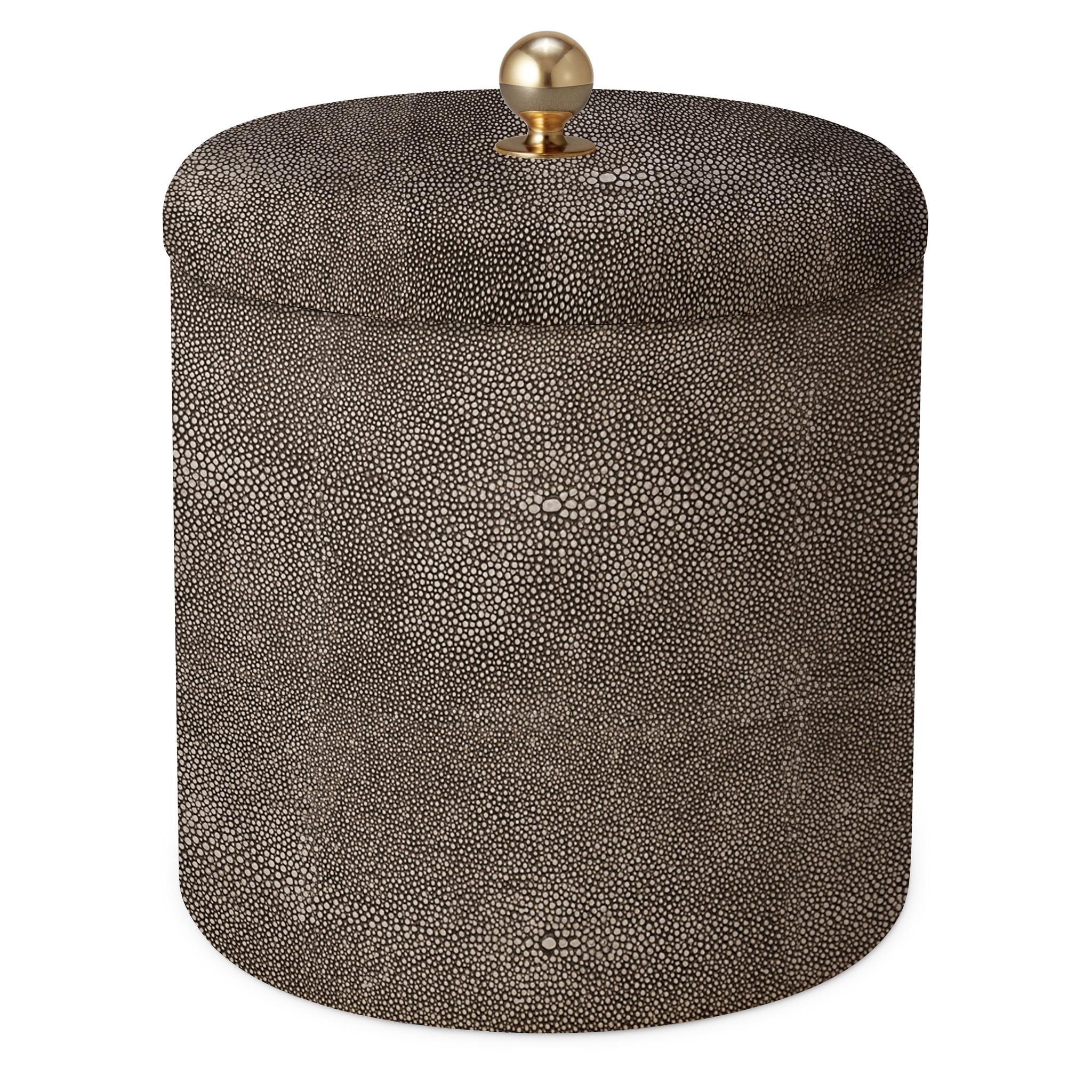A rounded, stylish ice bucket made of shagreen, with a brass knob on the lid, and a double-walled stainless steel interior. Combine with other Shagreen pieces in the AERIN barware collection to create an elegant home bar.