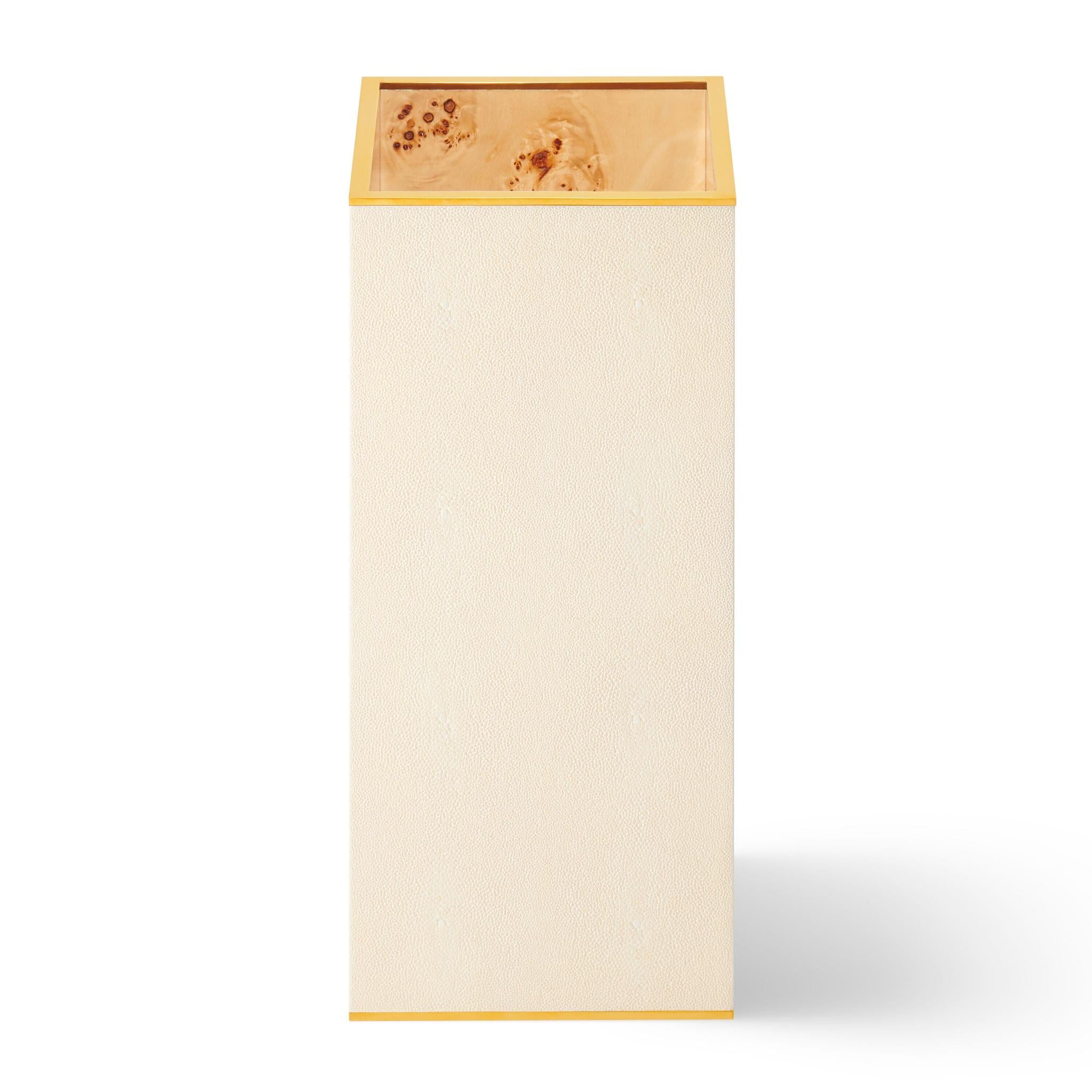 Crafted with a luxurious shagreen finish and brass detailing, this classic umbrella stand blends perfectly into a foyer. Finished with a  mappa burl interior, it includes a removable brass tray insert to collect water, and a suede base.