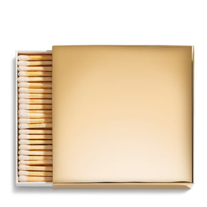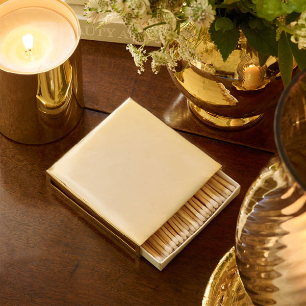 Crafted in smooth warm brass, this square sleeve holds a box of oversized matches. Styled with a strike card on one side and branded with AERIN on the underside, it is a stylish addition to a tabletop beside one of the scented candles from the AERIN collection.