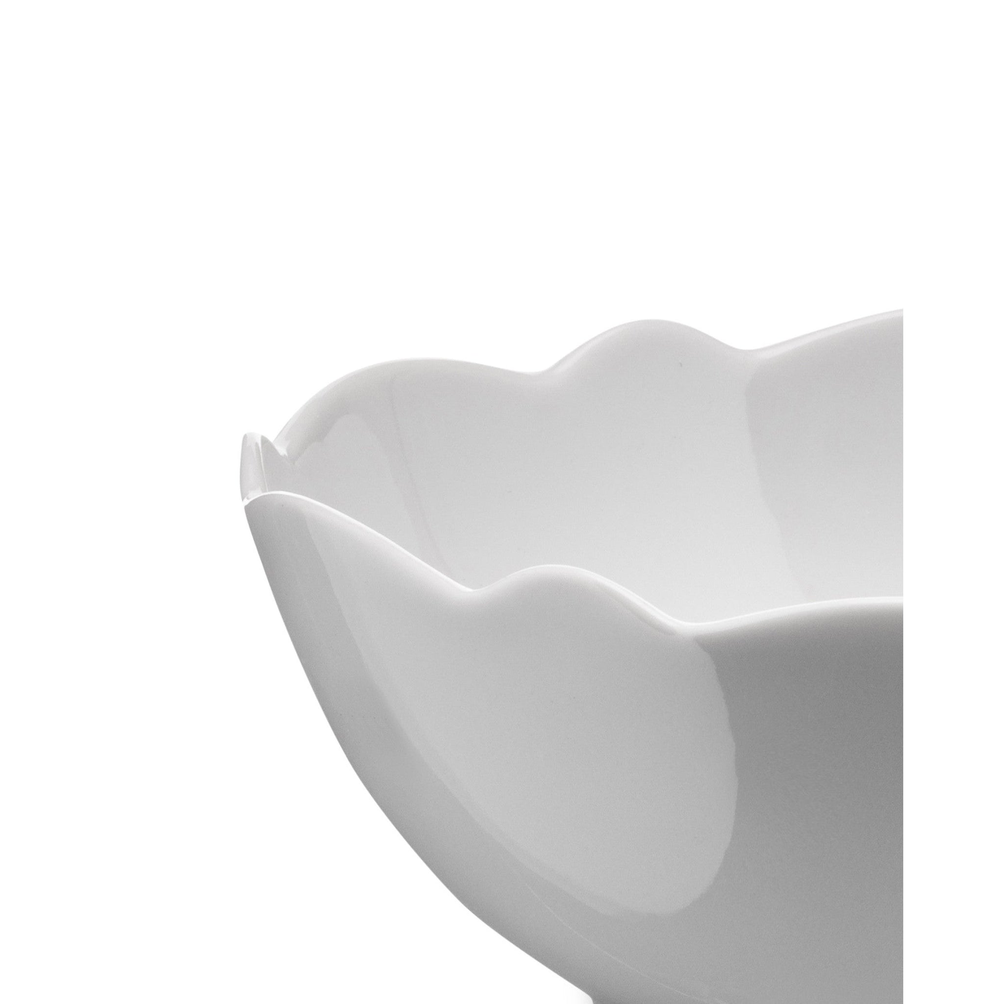 The delicate design and the finely scalloped edge of Dressed bowl make it an elegant object, ideal for completing and enriching every table. Thanks to its small size, it is also perfect for serving appetizers. It is made of white porcelain, like the other objects of the Dressed tableware.Bowl in white porcelain with relief decoration. 4 pieces.