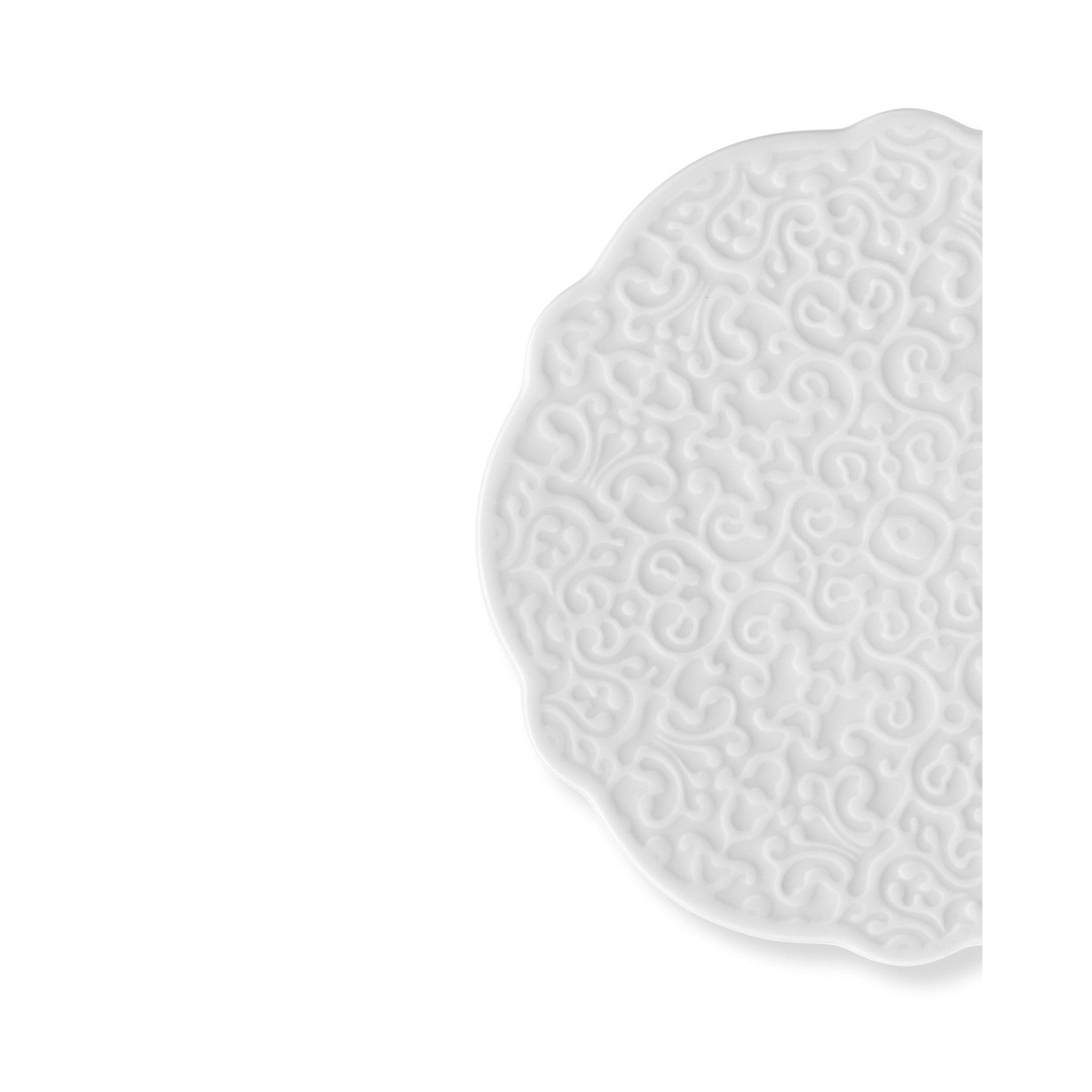 The perfect complement to the coffee cup, the Dressed coffee saucer is a precious object that can render every break unique. It is made of white porcelain and has a finely embossed decoration with the motif that characterises the entire Dressed collection.Saucer for mocha cup in white porcelain with relief decoration. 4 pieces.