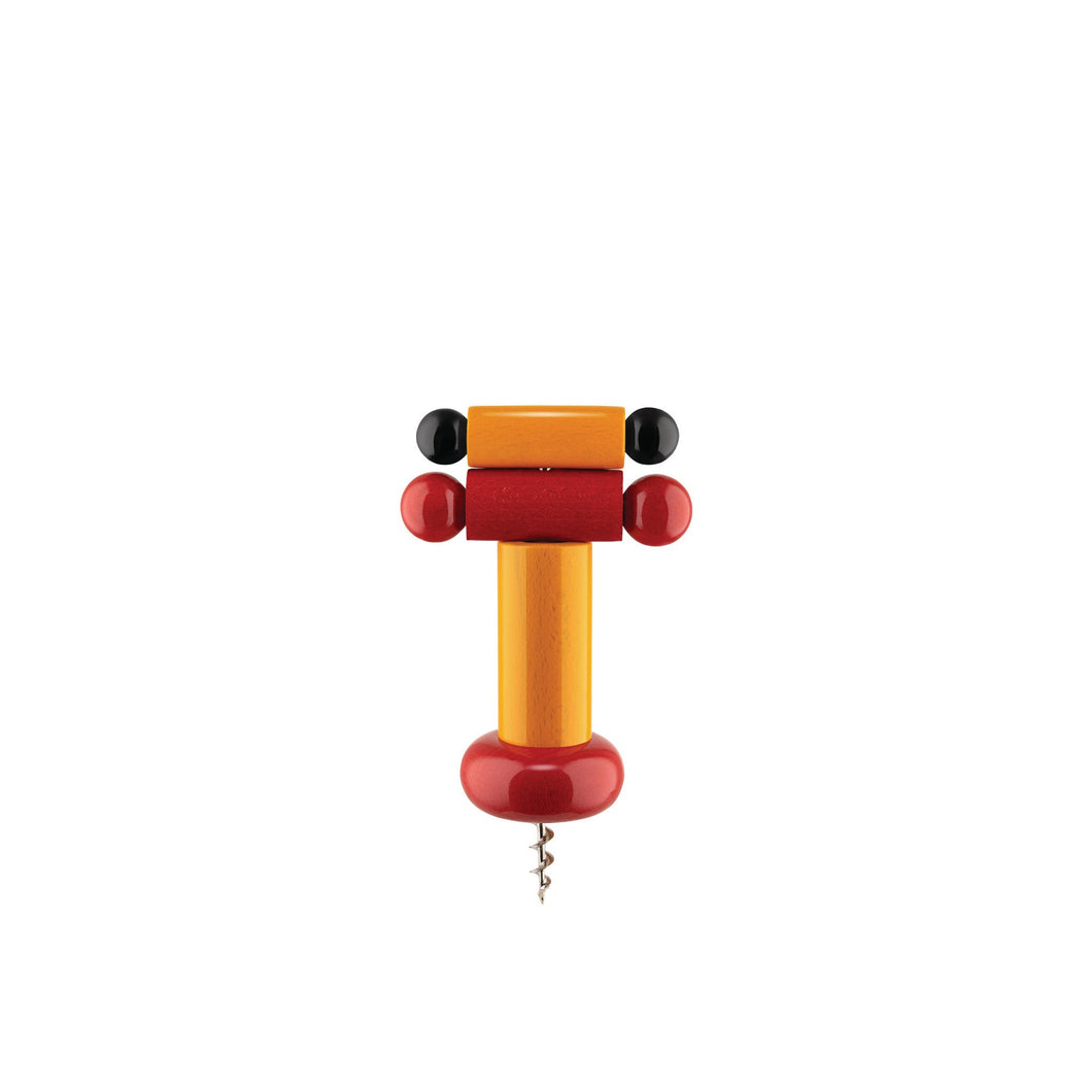 The corkscrew according to Ettore Sottsass: a tool both effective and emotional. Easy to use: the designed volumes reveal an ergonomic shape that is comfortable to hold. Made in Italy, near where Alessi is based, using a partly hand-crafted turning process with wood from sustainably managed forest. Coloured with water-based and totally solvent-free paints that are sustainable for the environment and not harmful to human health.Corkscrew in beech-wood.