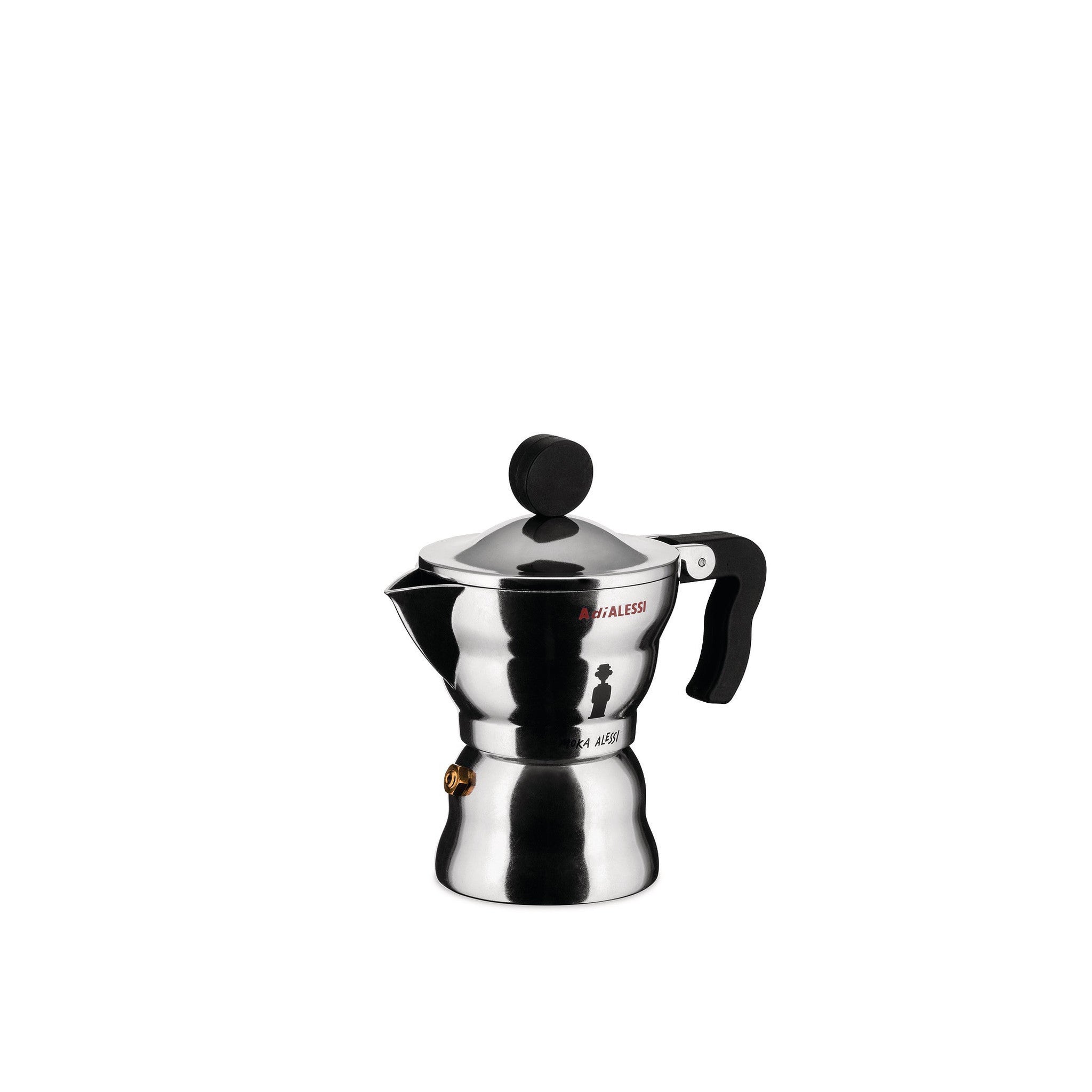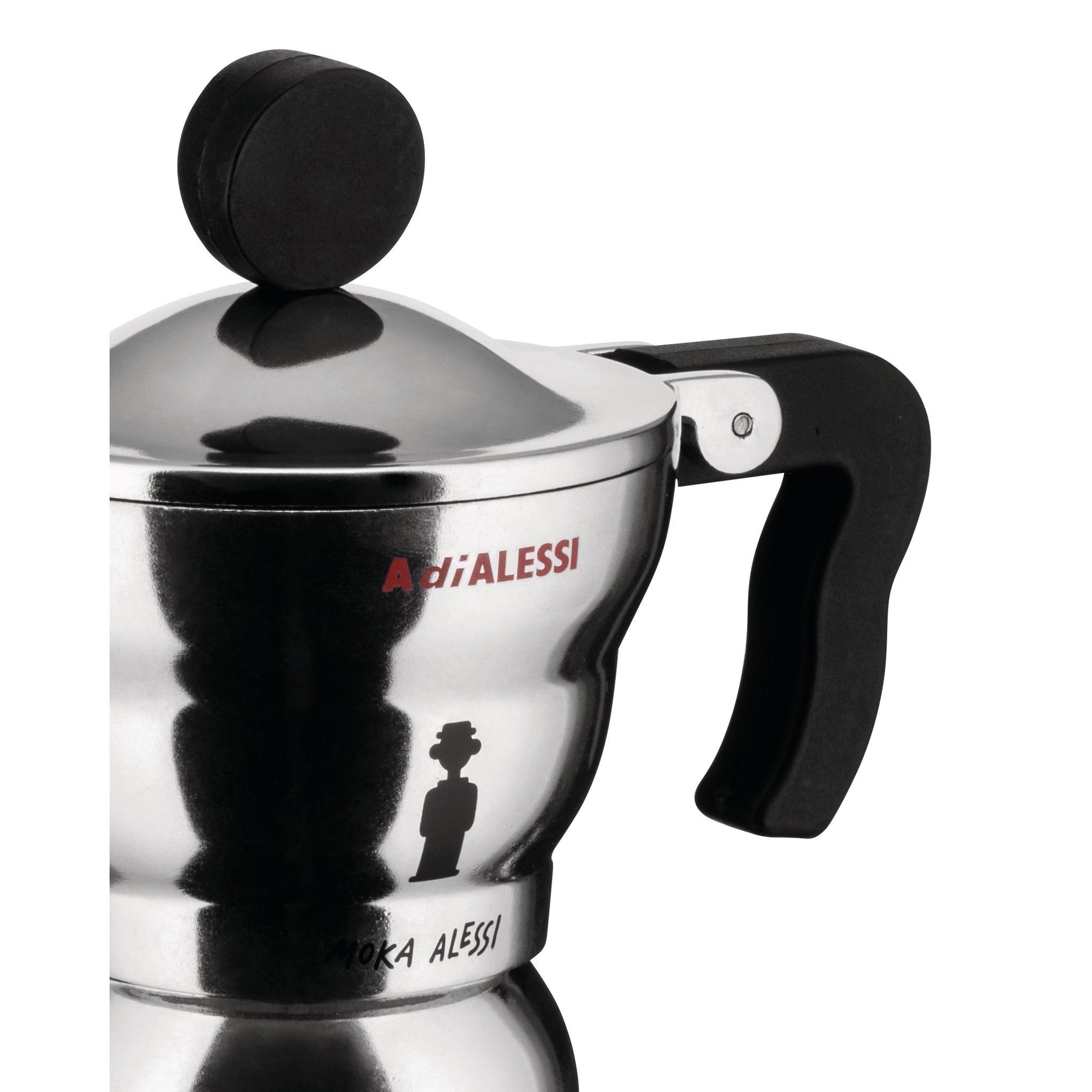The Moka Alessi coffee maker, created by Alessandro Mendini, has a round shape that expresses its relationship with the traditional moka. An espresso coffee maker in aluminium casting with an ergonomic handle and thermoplastic resin knob. A real and proper eulogy to the daily coffee rite.Espresso coffee maker in aluminium casting. Handle and knob in thermoplastic resin, black.