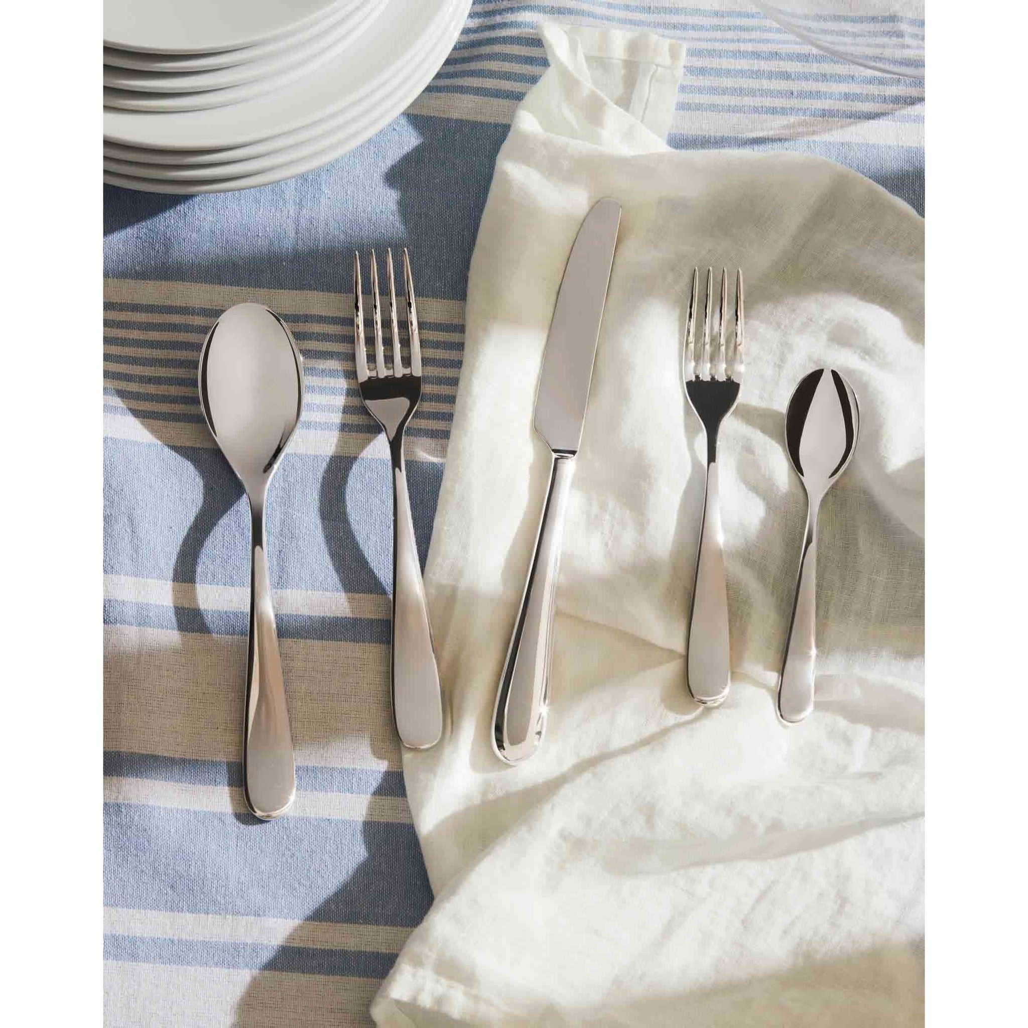 The table spoon of Nuovo Milano series has a soft grip which is pleasant to the touch and as mild and particularly rounded as the bowl's shape. A sculptural and sinuous design unite the cutleries of this elegant collection, designed by Ettore Sottsass in 1987.Table spoon in 18/10 stainless steel. 6 pieces.