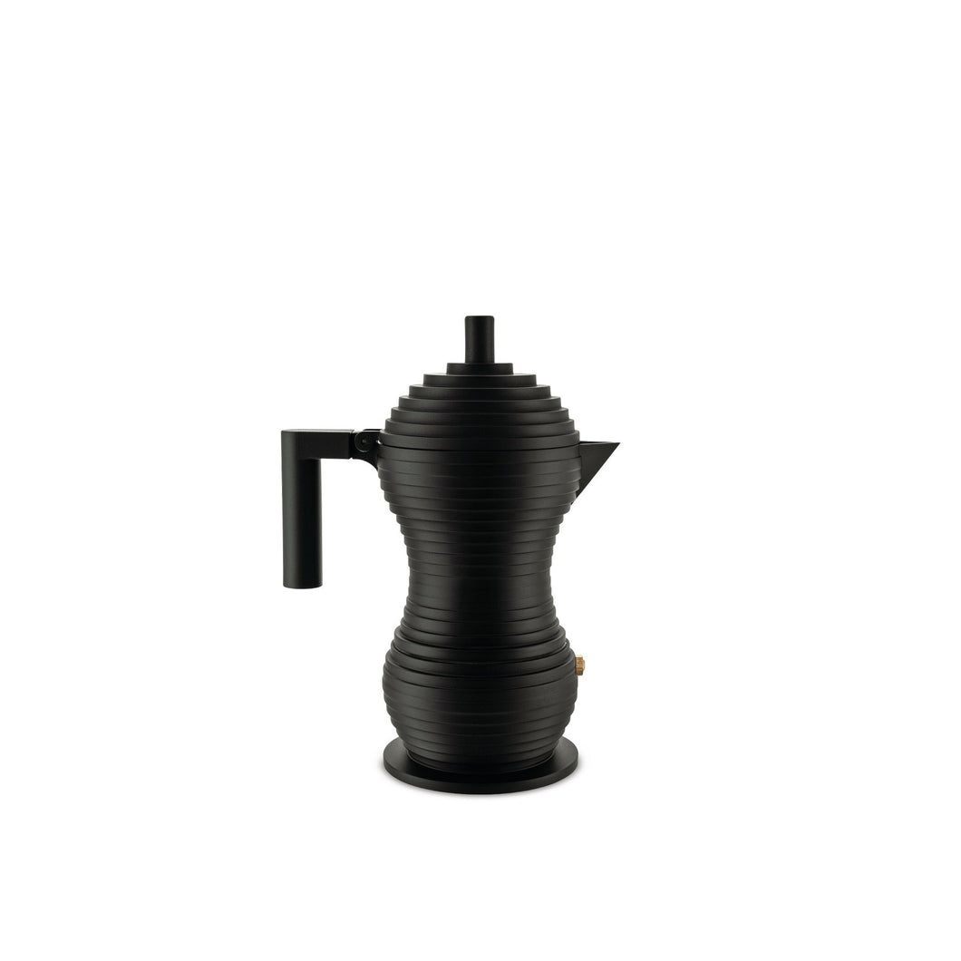 Presented in 2015, the Pulcina espresso coffee maker won over the public for its evocative design and its high performance. In the black version, the light plays with the unique stepped shape. Designed by Michele De Lucchi, Pulcina contains a small but revolutionary innovation that enhances the full-bodied taste of coffee. Dedicated to those who do not want to renounce the taste and aroma of coffee offered by an espresso coffee machine, but want to experience this daily ritual in a special way.Espresso coffee maker in aluminium casting, black. Handle and knob in PA, black.