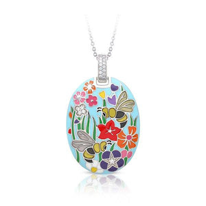 Walk through a beautiful garden with Italian Enamel bees and flowers. Translucent enamel bees happily pollinate colorful flower set with platinum-plated sterling silver and accent stones. Rejoice in the beauty of nature!