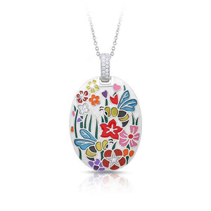 Walk through a beautiful garden with Italian Enamel bees and flowers. Translucent enamel bees happily pollinate colorful flower set with platinum-plated sterling silver and accent stones. Rejoice in the beauty of nature!