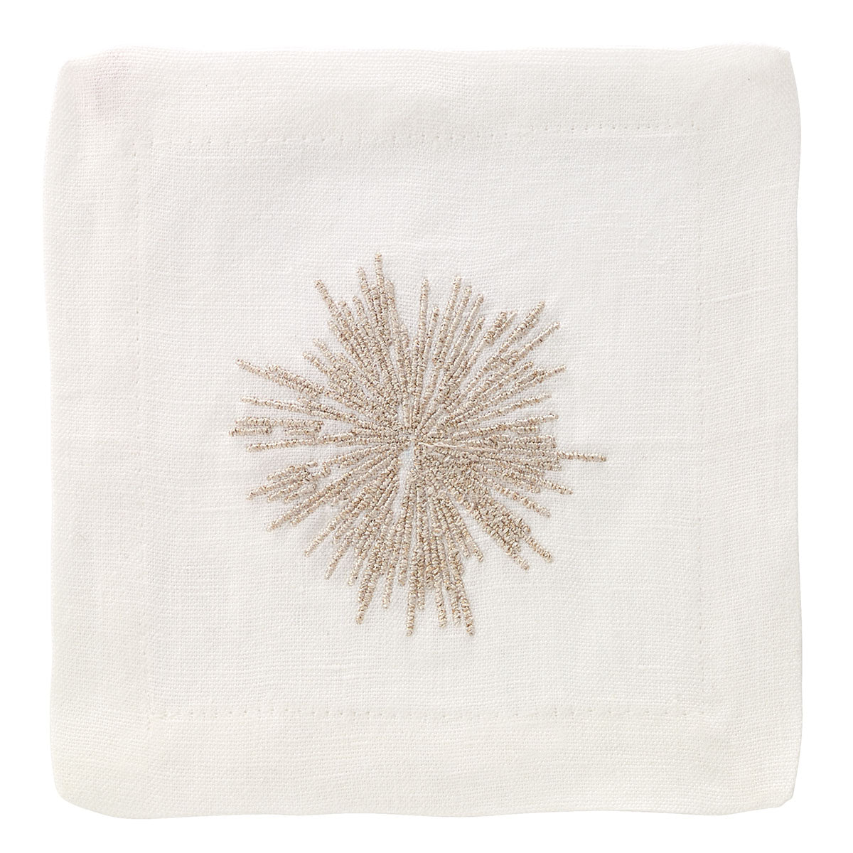 Starburst cocktail napkins are a festive holiday must have! The explosion of metallic embroidery on this exquisite white linen napkin is sure to leave your guest with a memorable holiday experience.