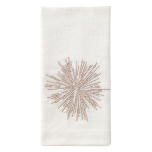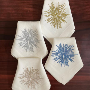 The explosion of metallic embroidery on this exquisite white linen napkin is sure to leave your guest with a memorable holiday experience. Starburst is the quintessential holiday party napkin!