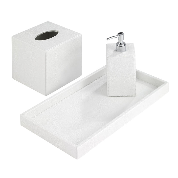 Size: Tissue Box 6" x 6" x 6"; Vanity Tray 14.25" x 7.5" x 1.5"; Soap Dispenser 3" x 3" x 7.5"; Guest Towel Box 8" x 5" x 1.25"; Waste Basket 9" x 9" x 11".