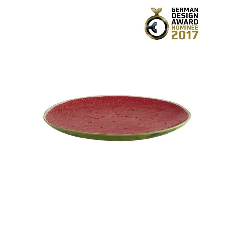 As a continuation of the vegetable and fruit collection by Bordallo Pinheiro, there is this collection of juicy and colourful watermelons. The collection includes bowls, fruit bowls, cake plates and presentation plates, these pieces replicate the fruit through irregularities in the shapes, the texture of the fruit pulp, the details on the seeds and the bright colours and painting on the pieces.