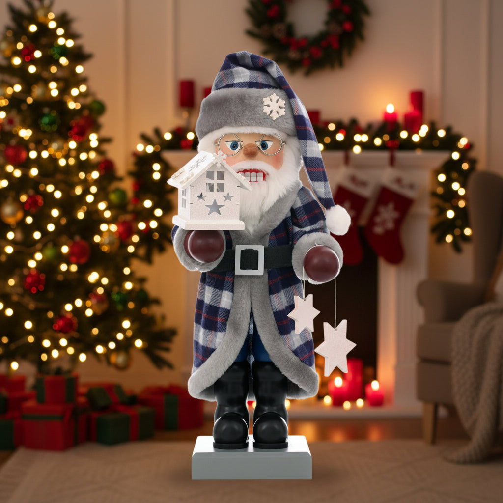 - His robe radiates warmth. Well wrapped up, he'll be ready for Christmas Eve. He loves it when the stars shine in the sky. Speaking of which, the little Christmas house on his arm comes with an LED tea light. Bring the sparkle home with you.