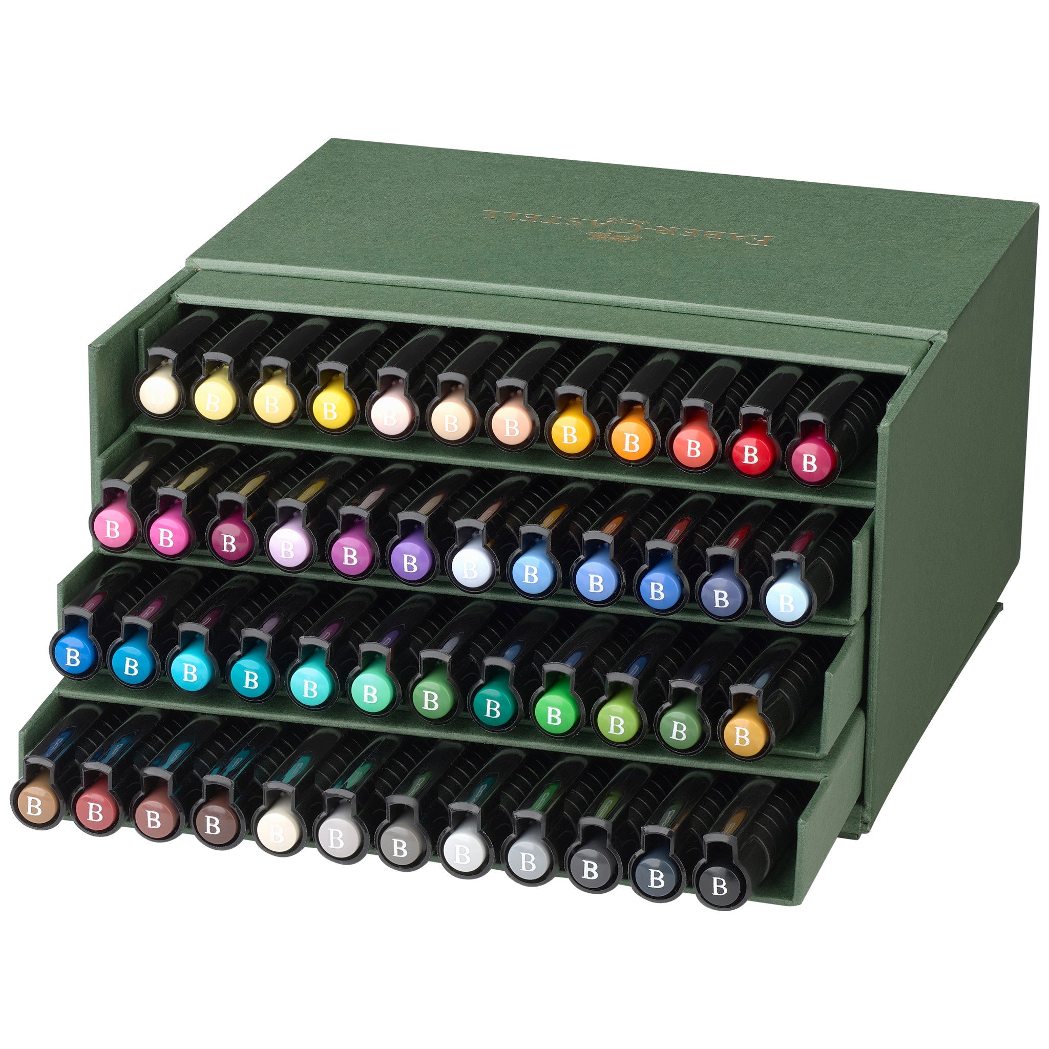 Contents Include: 48 Brush Pens #103 Ivory, #104 Light Yellow Glaze, #107 Cadmium Yellow, #108 Dark Cadmium Yellow, #109 Dark Chrome Yellow, #110 Phthalo Blue, #112 Leaf Green, #113 Orange Glaze, #114 Pale Pink, #116 Apricot, #118 Scarlet Red, #120 Ultramarine, #121 Pale Geranium Lake, #125 Middle Purple Pink, #127 Pink Carmine, #129 Pink Madder Lake, #132 Beige Red, #133 Magenta, #134 Crimson, #136 Purple Violet, #143 Cobalt Blue, #146 Sky Blue, #148 Ice Blue, #153 Cobalt Turquoise, #154 Light Cobalt Turquoise, #156 Cobalt Green, #157 Dark Indigo, #161 Phthalo Green, #162 Light Phthalo Green, #167 Permanent Green Olive, #169 Caput Mortuum, #170 May Green, #174 Chromium Green Opaque, #175 Dark Sepia, #180 Raw Umber, #192 India Red, #199 Black, #220 Light Indigo, #230 Cold Grey I, #232 Cold Grey III, #235 Cold Grey VI, #239 Lilac, #247 Indanthrene Blue, #264 Dark Phthalo Green, #268 Green Gold, #270 Warm Grey I, #272 Warm Grey III, and #273 Warm Grey IV in a gift box