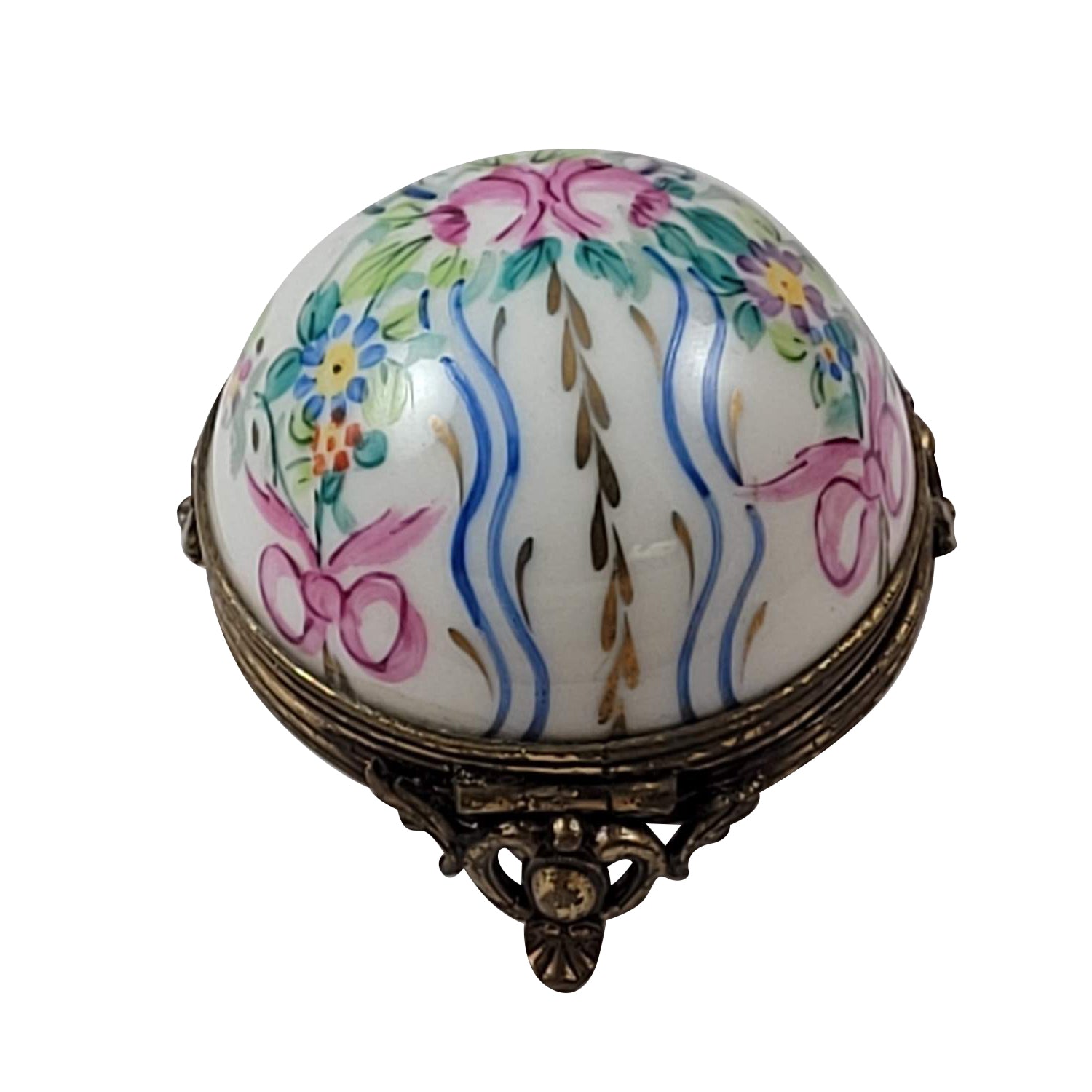 The Floral Dome with Blue Ribbons & Flowers on Brass Base Limoges Box is artfully and colorfully hand painted by premier artists using many of the same techniques that were used during their introduction in the 17th century. Steeped in history, Limoges boxes feature exquisite designs, superior workmanship, and the ultimate attention to detail.