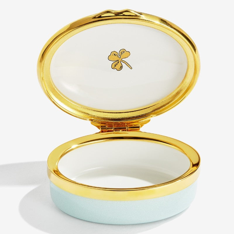 A token of thanks to an individual who has provided a friendship like no other, this charming handcrafted enamel box is a truly special gift. The base is a light teal colour while the lid features hand painted golden clovers, including one four leaf, framing the words, 'A friend is like a four leaf clover, hard to find but lucky to have'.