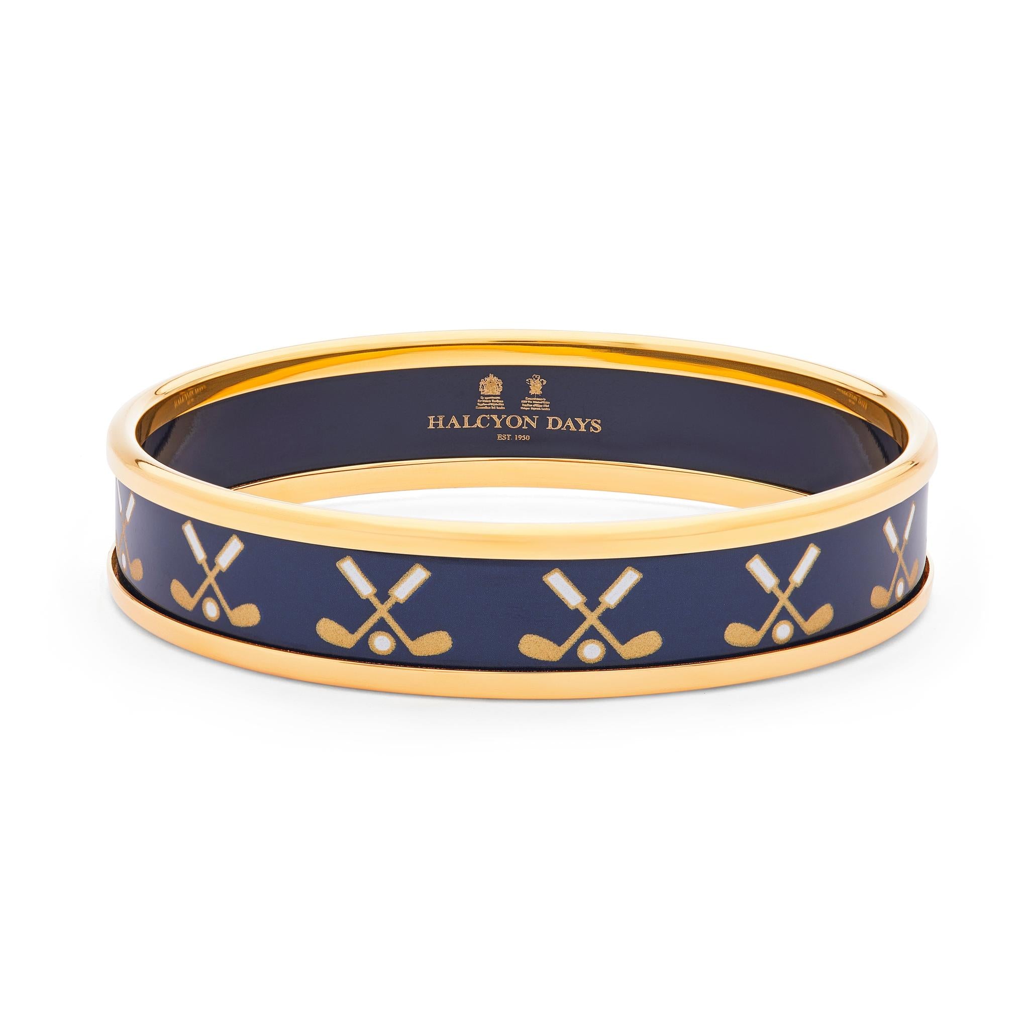 This English-made enamel bangle showcases a sleek golf club design on a deep navy background. Expertly handcrafted, it offers a unique and stylish accessory for golf lovers, combining sporty flair with classic elegance. Durable, lightweight, and comfortable, it's an ideal gift or personal statement piece.