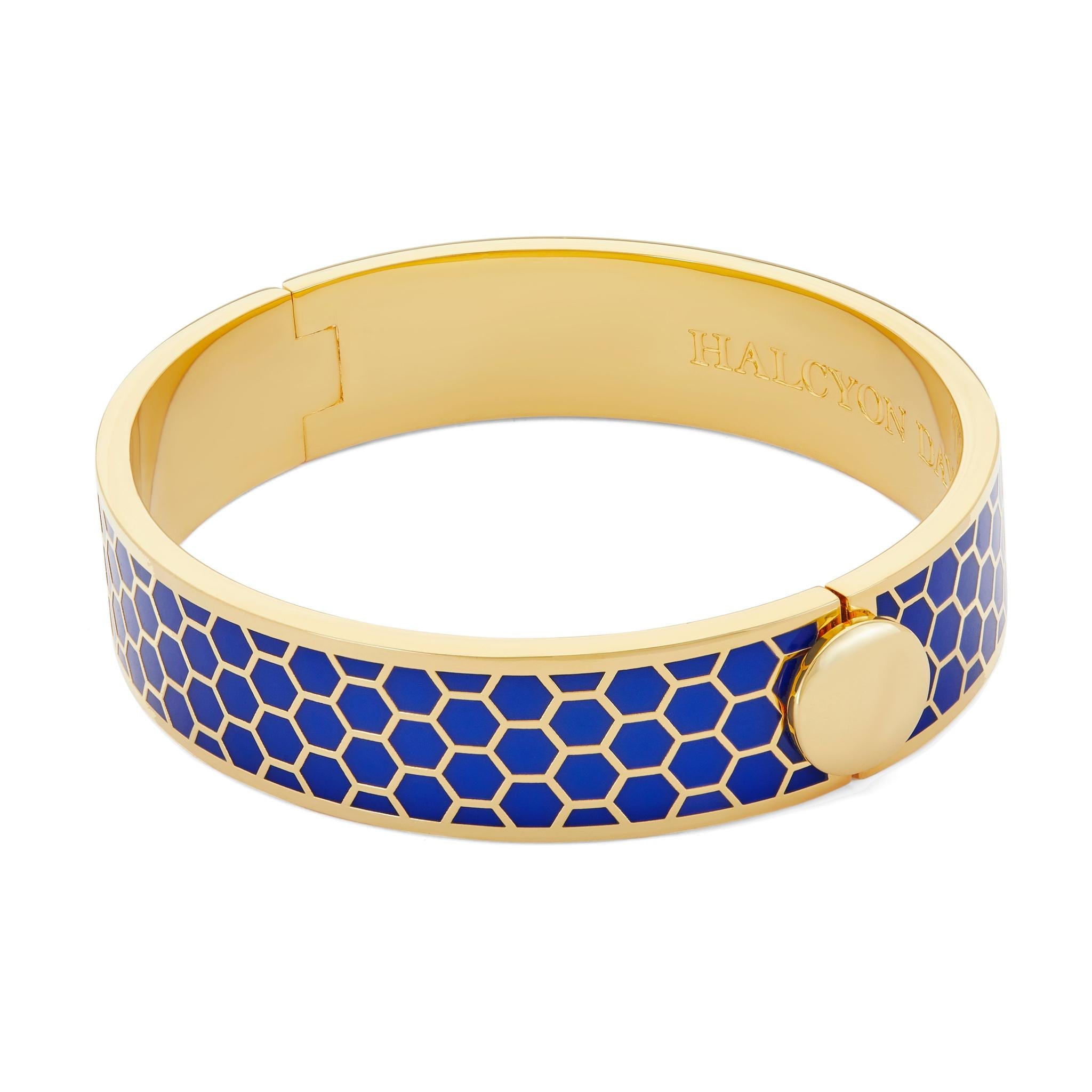 The Honeycomb Hinged Bangle is a perfect blend of modern style and timeless elegance. This stunning piece features a meticulously crafted gold honeycomb pattern set against a sleek cobalt blue enamel base.