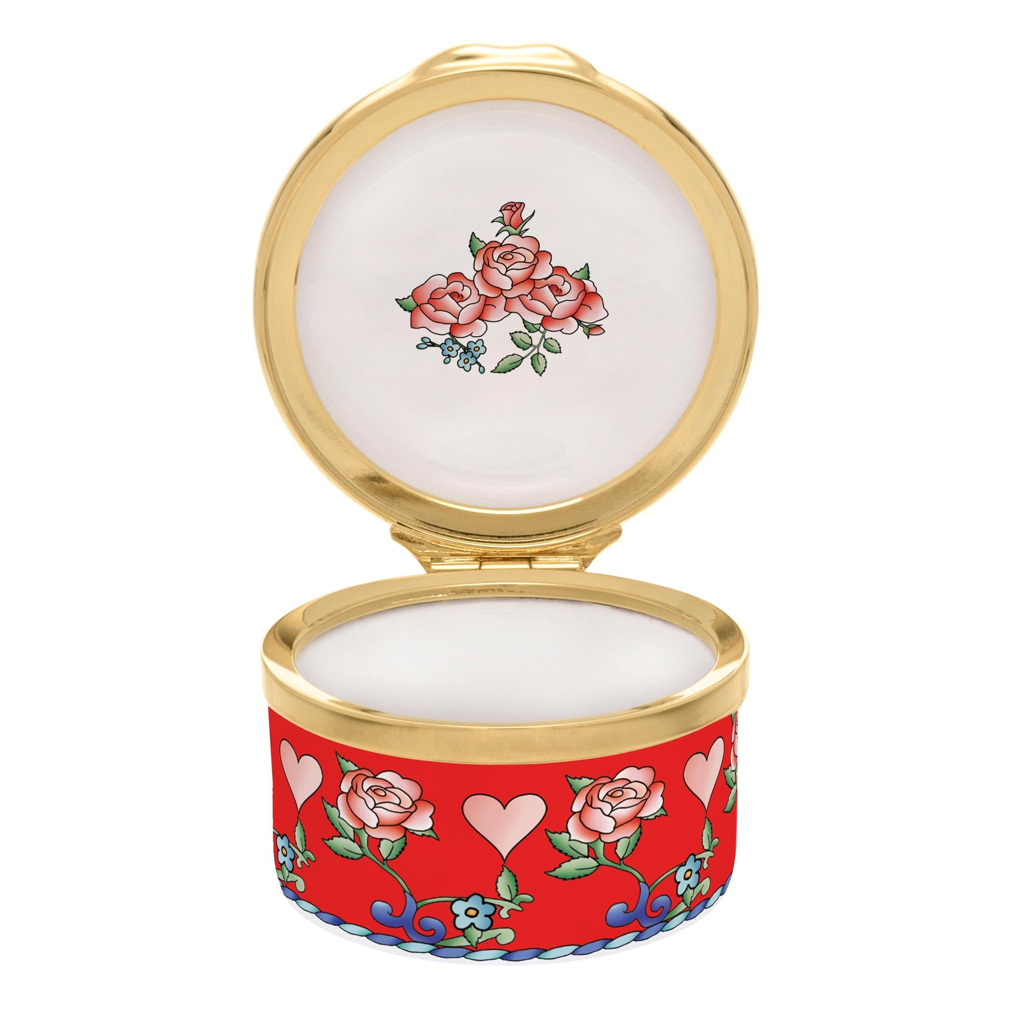 This elegant "I Love You" Enamel Box is perfect for gifting to a loved one on Valentine's Day or any special occasion. Entirely handmade with traditional methods from rich red enamel on copper. The meticulously decorated lid is inspired by the enchanting illustrative style of Victorian Valentine cards and features a stunning display of roses encircling a heart at its core. Within this heart the timeless declaration "I love you," promises long-lasting devotion.