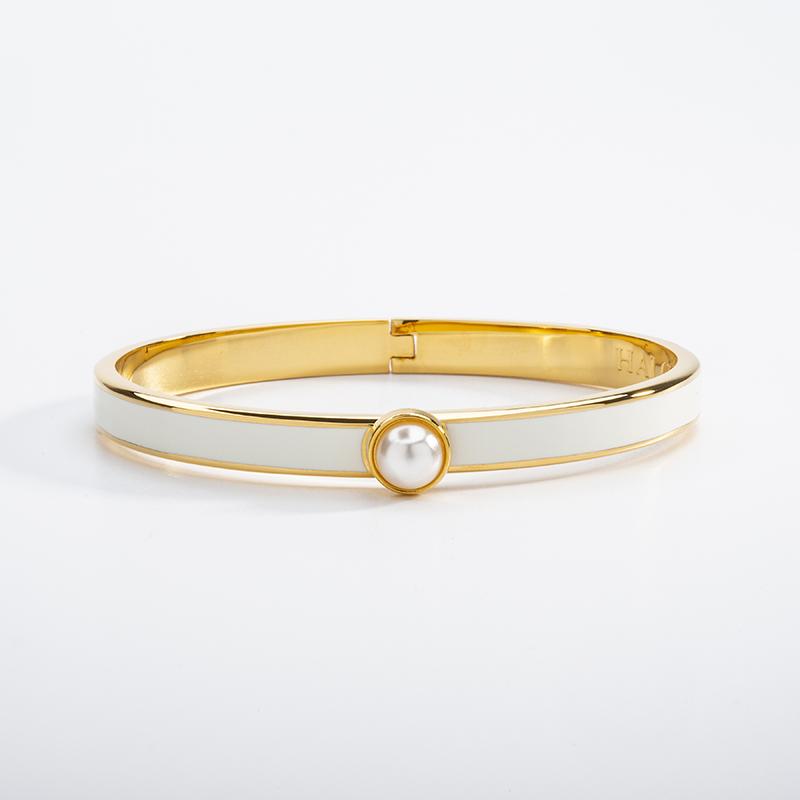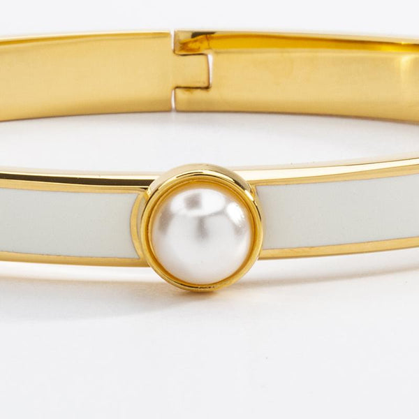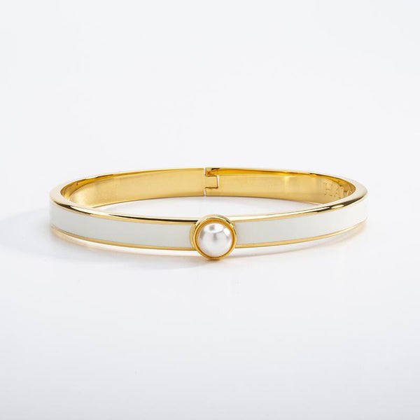 The Skinny Cabochon Pearl 6mm wide bangle provides something for everyone. A refined cabochon pearl acts as a discreet clasp on this sophisticated cream enamel bangle.