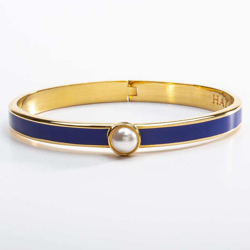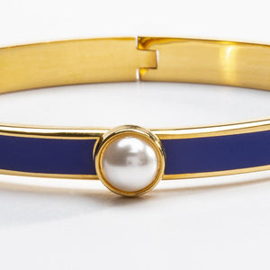 The Skinny Cabochon Pearl 6mm wide bangle provides something for everyone. A refined cabochon pearl acts as a discreet clasp on this sophisticated deep cobalt enamel bangle.