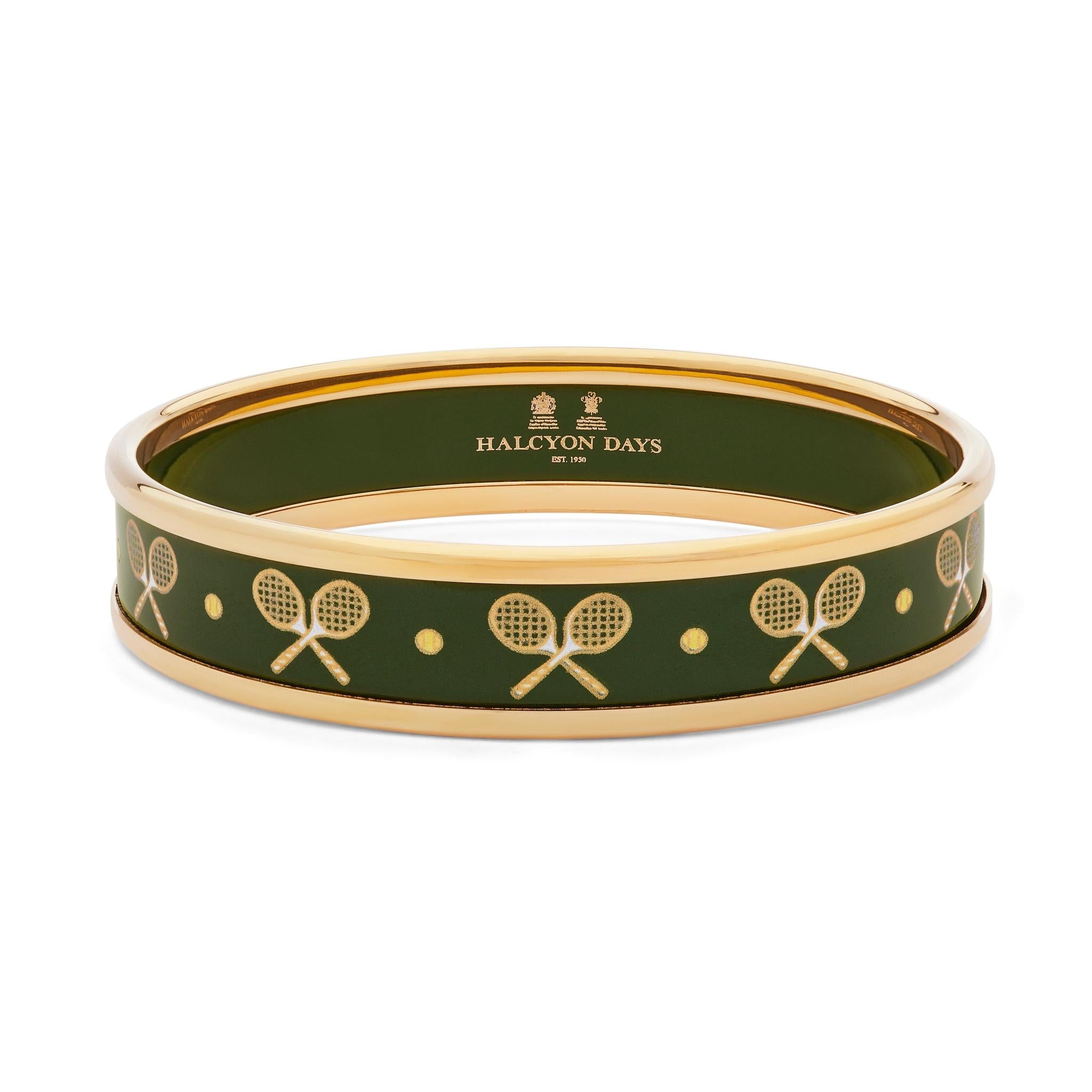 This handcrafted English enamel bangle features a tennis racket design on a sleek green background. Stylish, durable, and lightweight, it's the perfect accessory for tennis lovers.