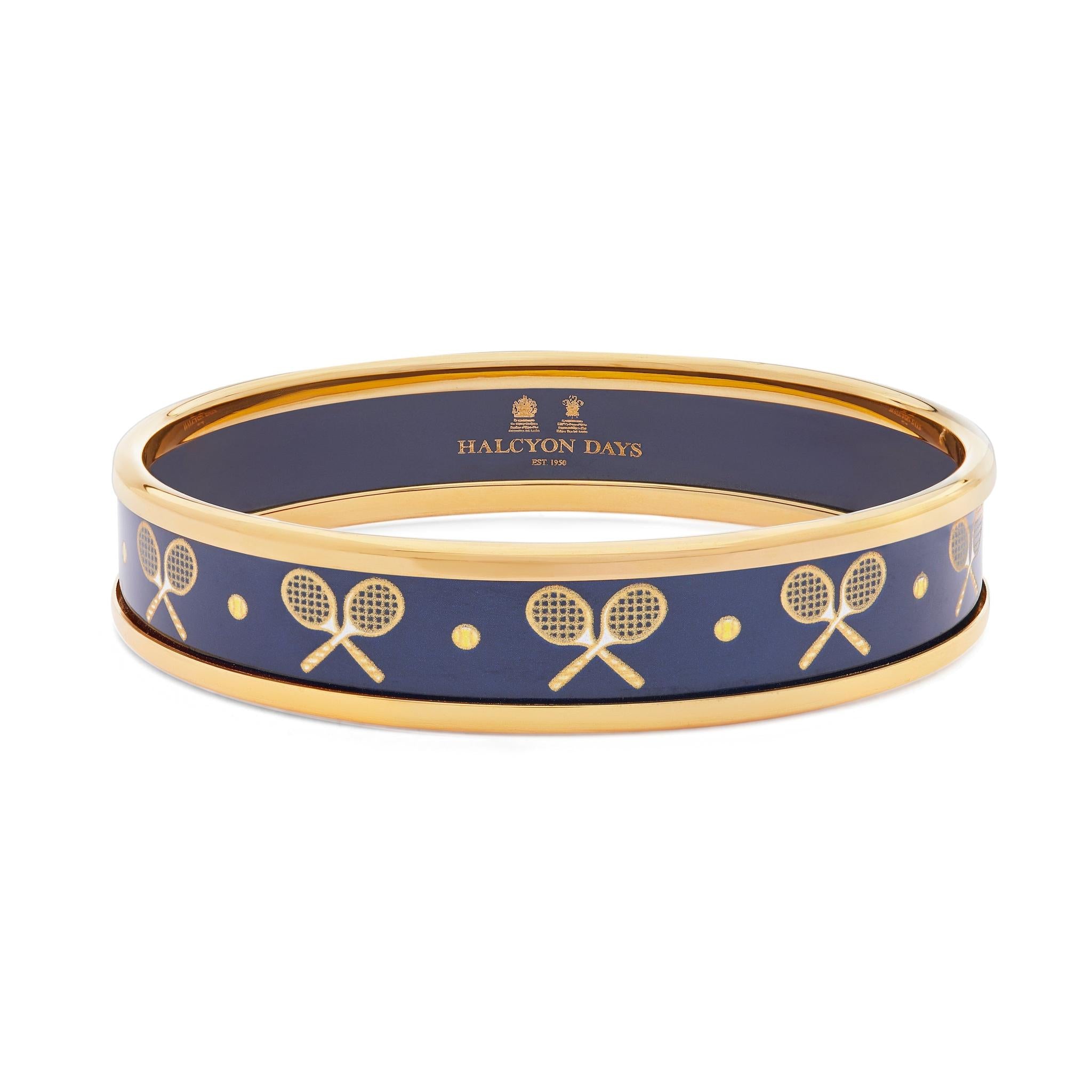This handcrafted English enamel bangle features a tennis racket design on a sleek navy background. Stylish, durable, and lightweight, it's the perfect accessory for tennis lovers.
