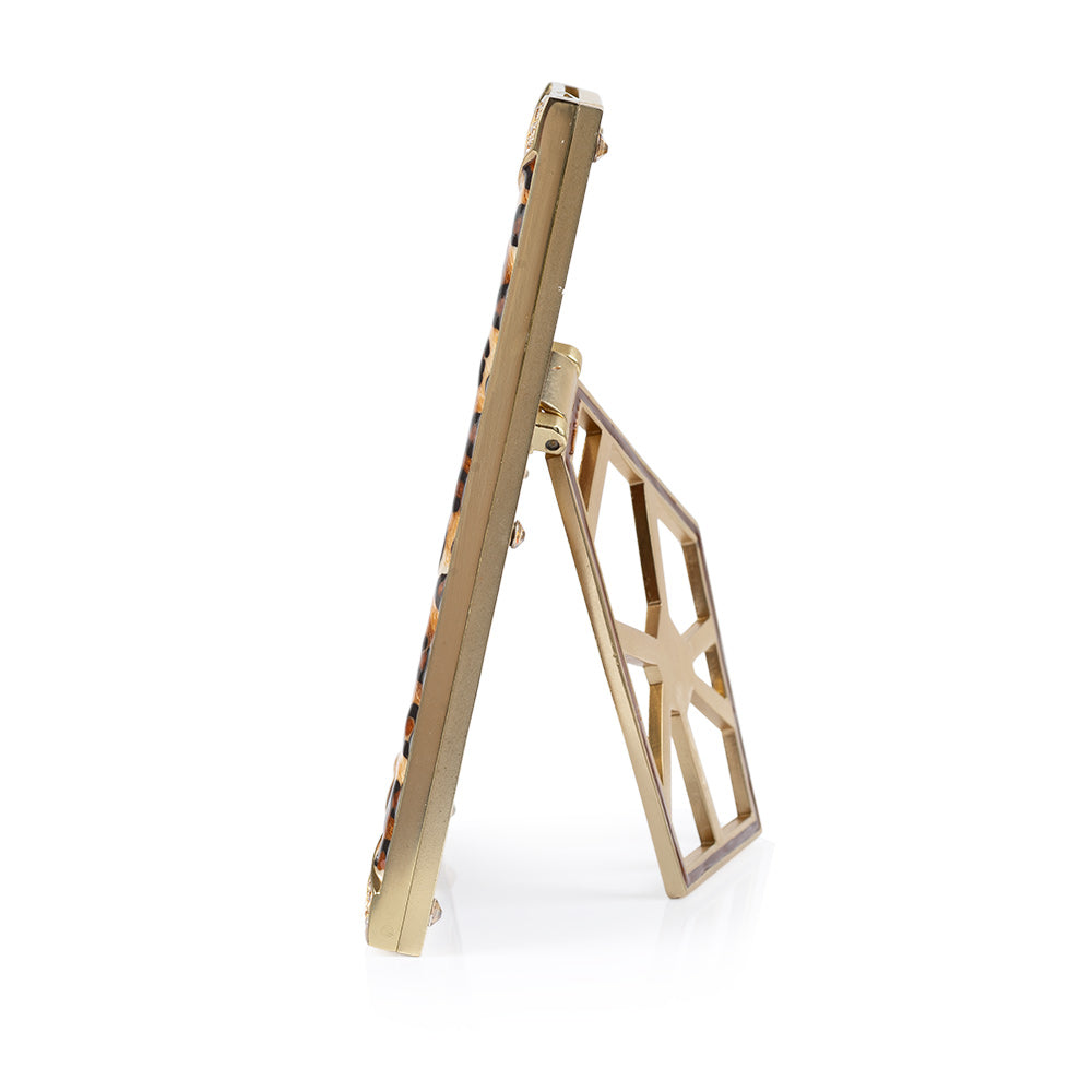 The 4x6 Lavinia Frame in Leopard is a bold and sophisticated statement piece that will add a touch of wild elegance to any space. Crafted with meticulous attention to detail, the Lavinia frame is embellished with a stunning leopard print pattern and accented with shimmering European crystal pavé corners. Made from premium materials, including durable zinc and plated in elegant 14K gold, the Lavinia Frame promises to showcase your precious moments with unrivaled beauty and a hint of exotic allure. Metal back plate and kickstand, the frame is truly beautiful from any view, stands horizontally and vertically.