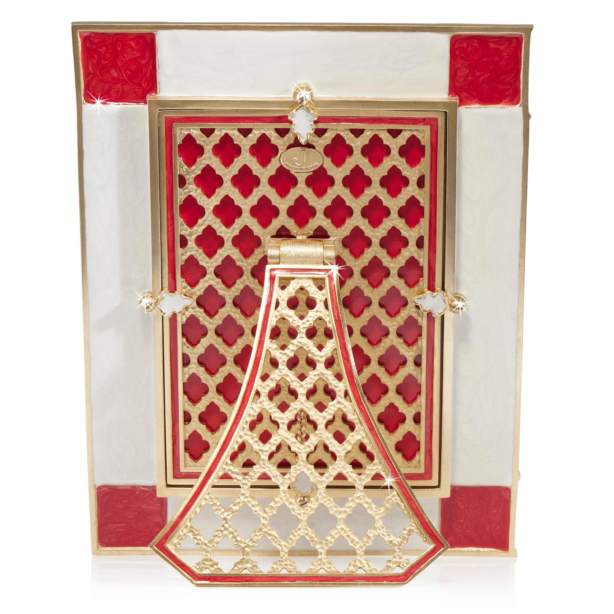 Pewter frame with a 14K gold finish, hand-enameled and hand-set with European crystals at the Jay Strongwater Rhode Island workshop.