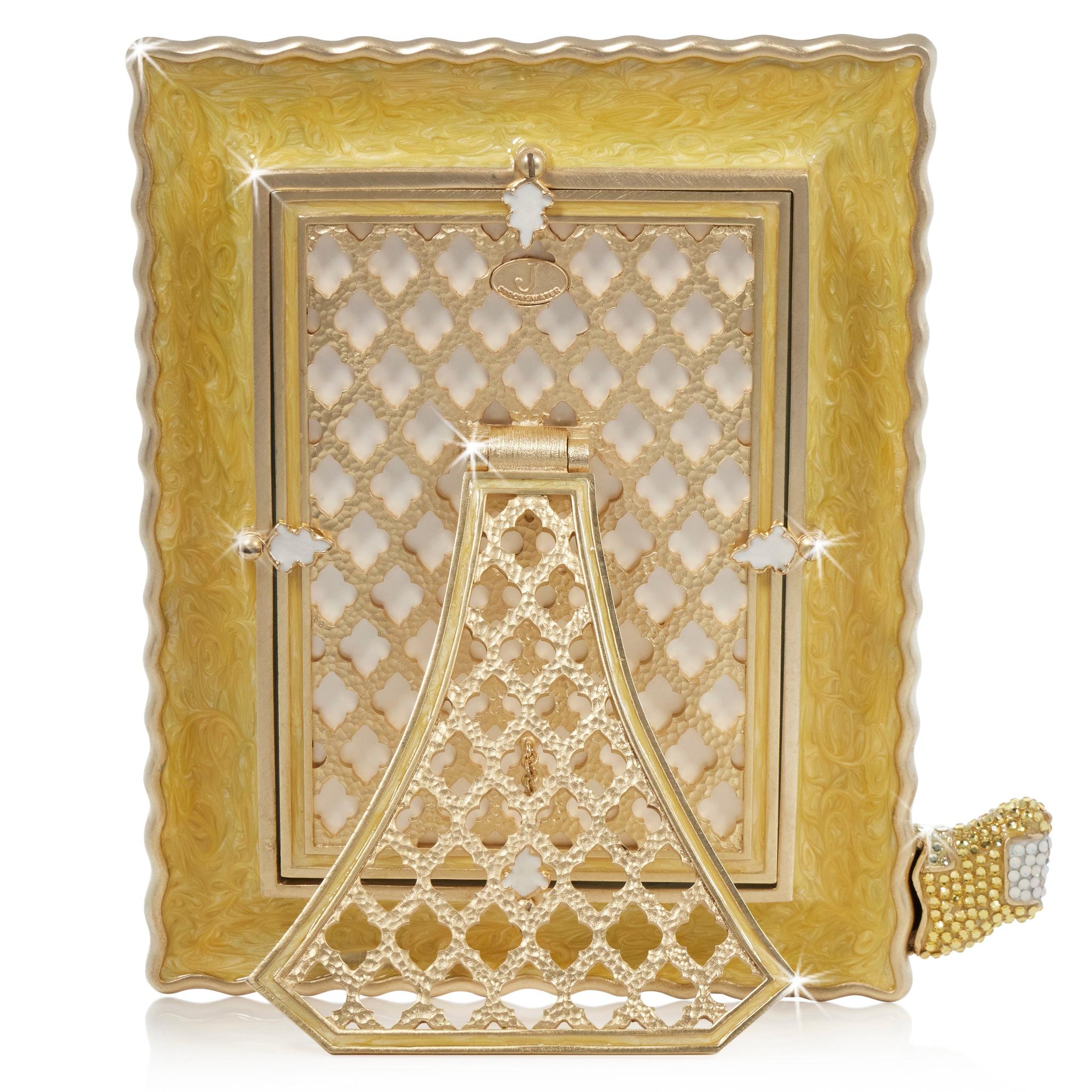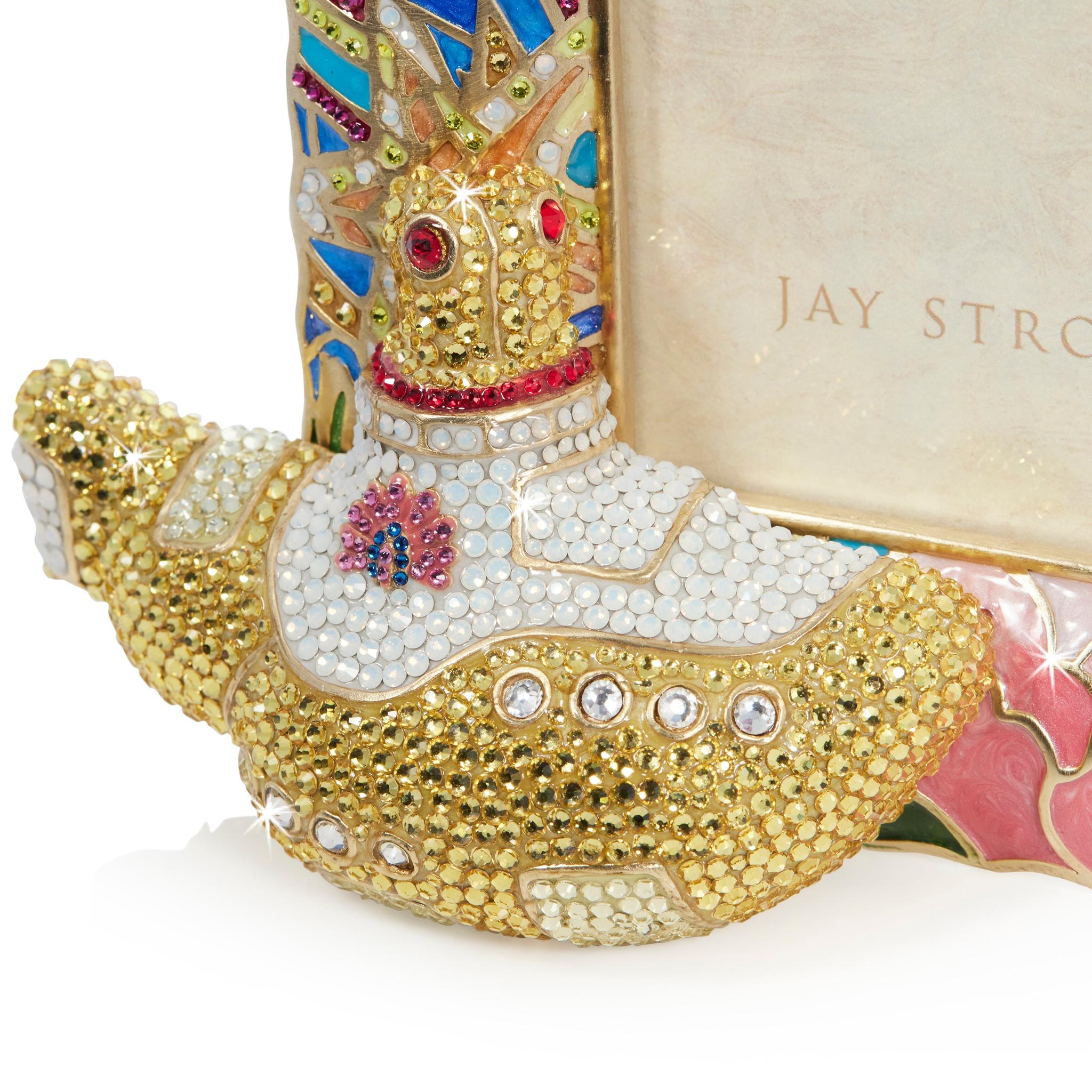 Pewter frame with a 14K gold finish, hand-enameled and hand-set with 500 European crystals at the Jay Strongwater Rhode Island workshop.