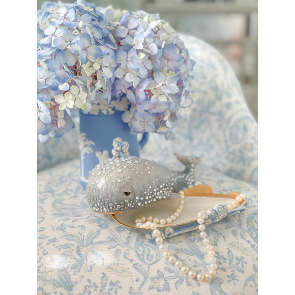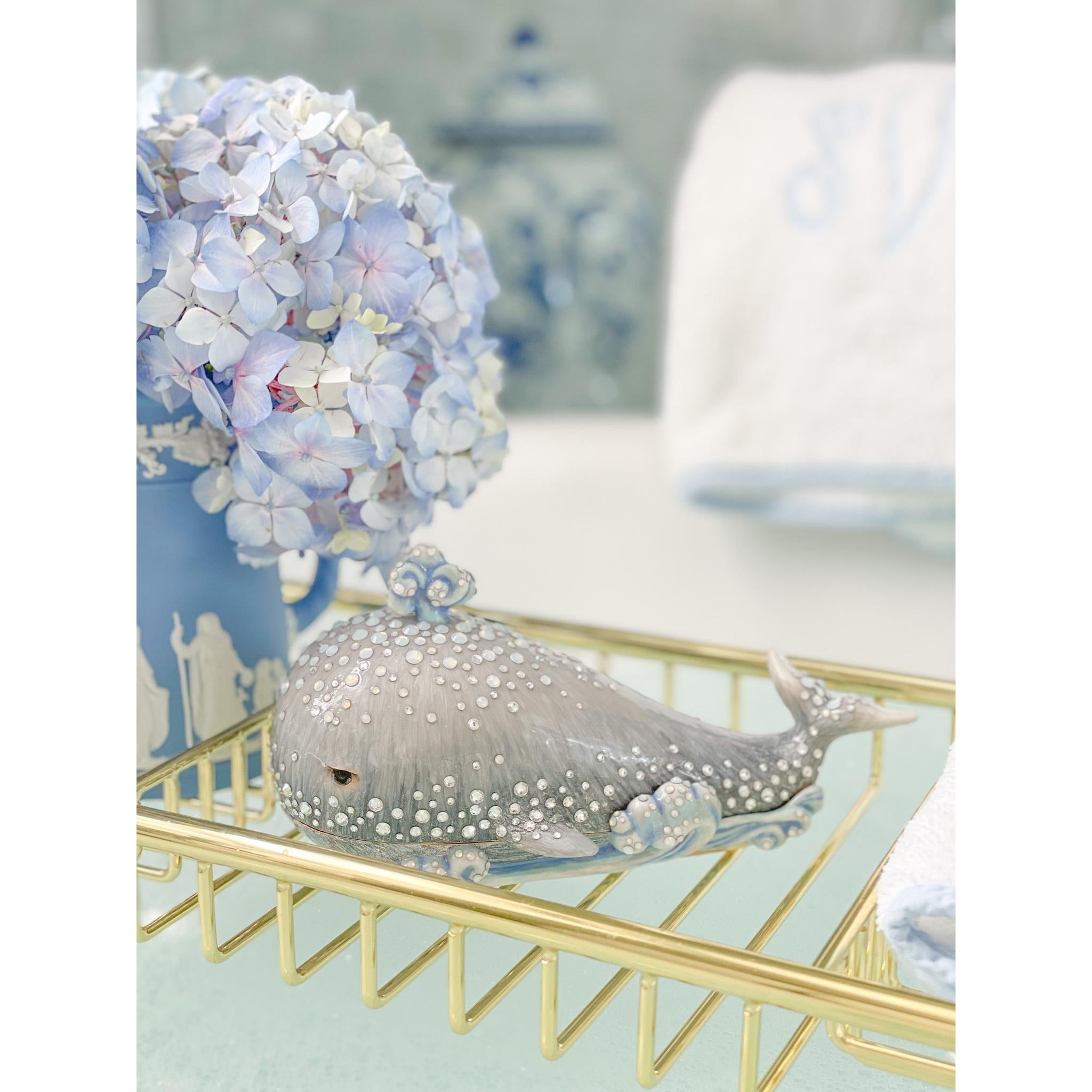 Marvel at the wonder of the seas with this detailed trinket box fashioned after a gray whale breaching the waves. Hand-enameled and inlaid with 537 individual crystals, this whimsical whale box lifts open to reveal an ivory enamel interior rimmed in 14K gold.