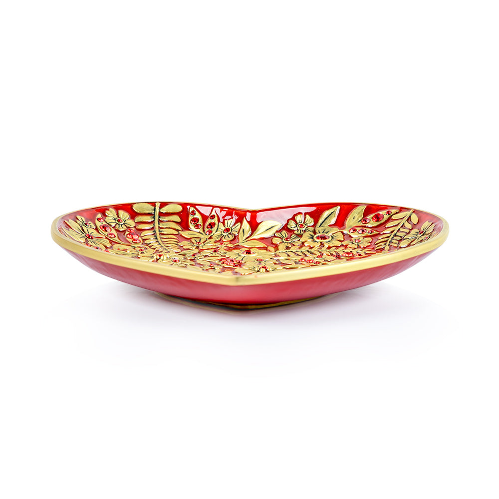 A field of delicate flora etched on our romantic Aria Floral Heart Trinket Tray, adorned with hand-painted washes of ruby enamels that highlight the intricate textures of each leaf and flower. This high-quality zinc tray, plated in 14K gold and accented with translucent ruby enamel on the underside, is further enhanced by hand-set Europeans crystals.