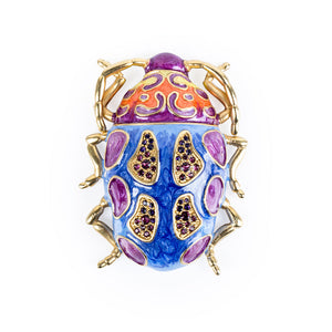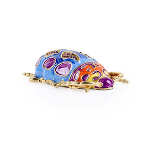 Admire the iridescent wonder of our Jewel Beetle Trinket Box. This exquisite piece, crafted from fine pewter and plated in 14K gold, captures the vibrant beauty of nature's most dazzling creatures. Its intricate design features a captivating blend of vivid enamels in shades of sapphire, amethyst, and ombre sunset, adorned with shimmering European crystals that enhance its allure.