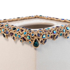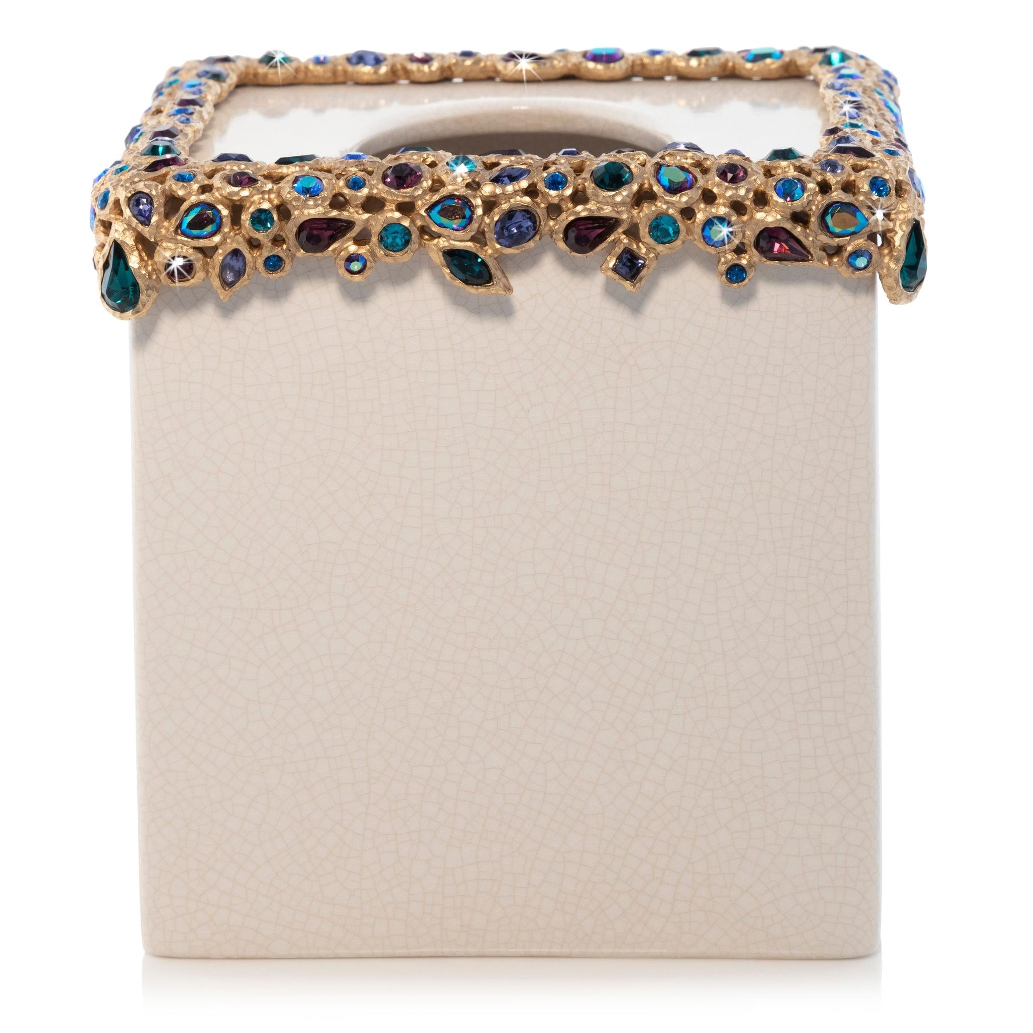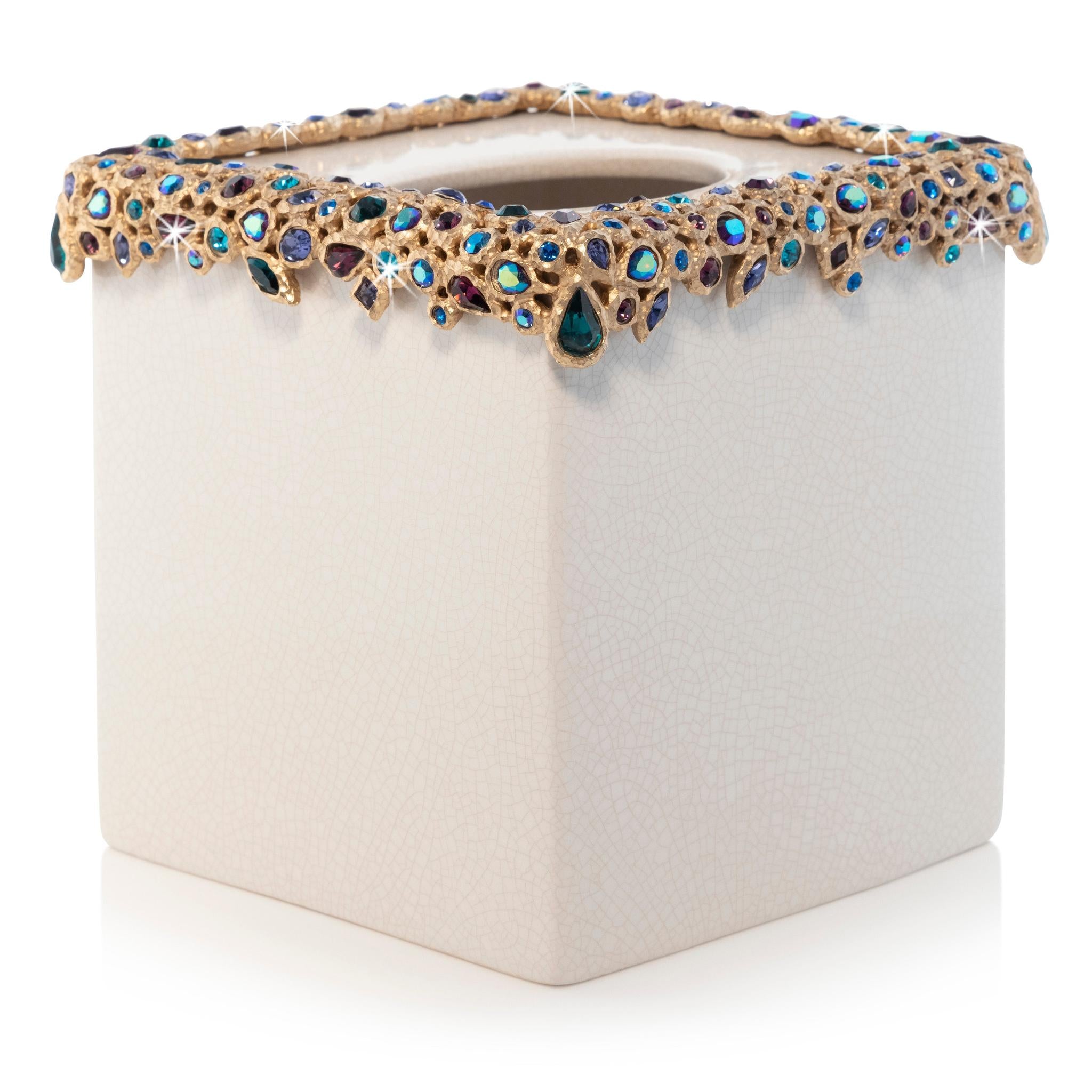 A sparkling crown of 14K gold and peacock-hued Swarovski® gems tops our bejeweled decorative tissue box, bringing elegance to the everyday. Prepare to be dazzled each time you reach for it--somehow both simple and extravagant at once, this decorative piece perfectly captures the essence of elevated living-- the ideal luxe touch for wherever you are.