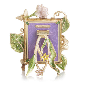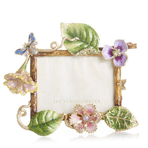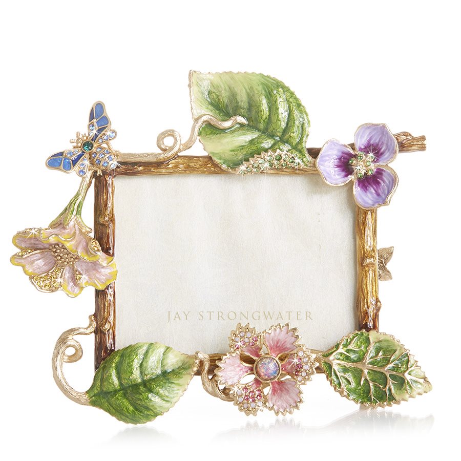 Our artistry shines with this gorgeous fusion of jeweled flowers and luscious leaves wrapped around the Fray Floral 3” x 4” Frame. A mix of hand-painted pansies, carnations and a dragonfly pop against the verdant green leaves. Sparkling with Swarovski® crystals handset by our finest artisans in Rhode Island.