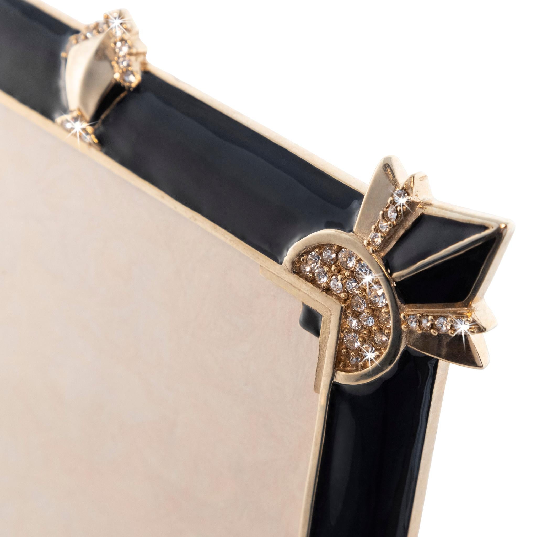 Drawing inspiration from classic Art Deco style, this classic 5x7 frame is the epitome of timeless elegance. Gleaming 18K gold contrasts beautifully against its rich black enamel, and Swarovski crystals add the perfect amount of understated glamour.