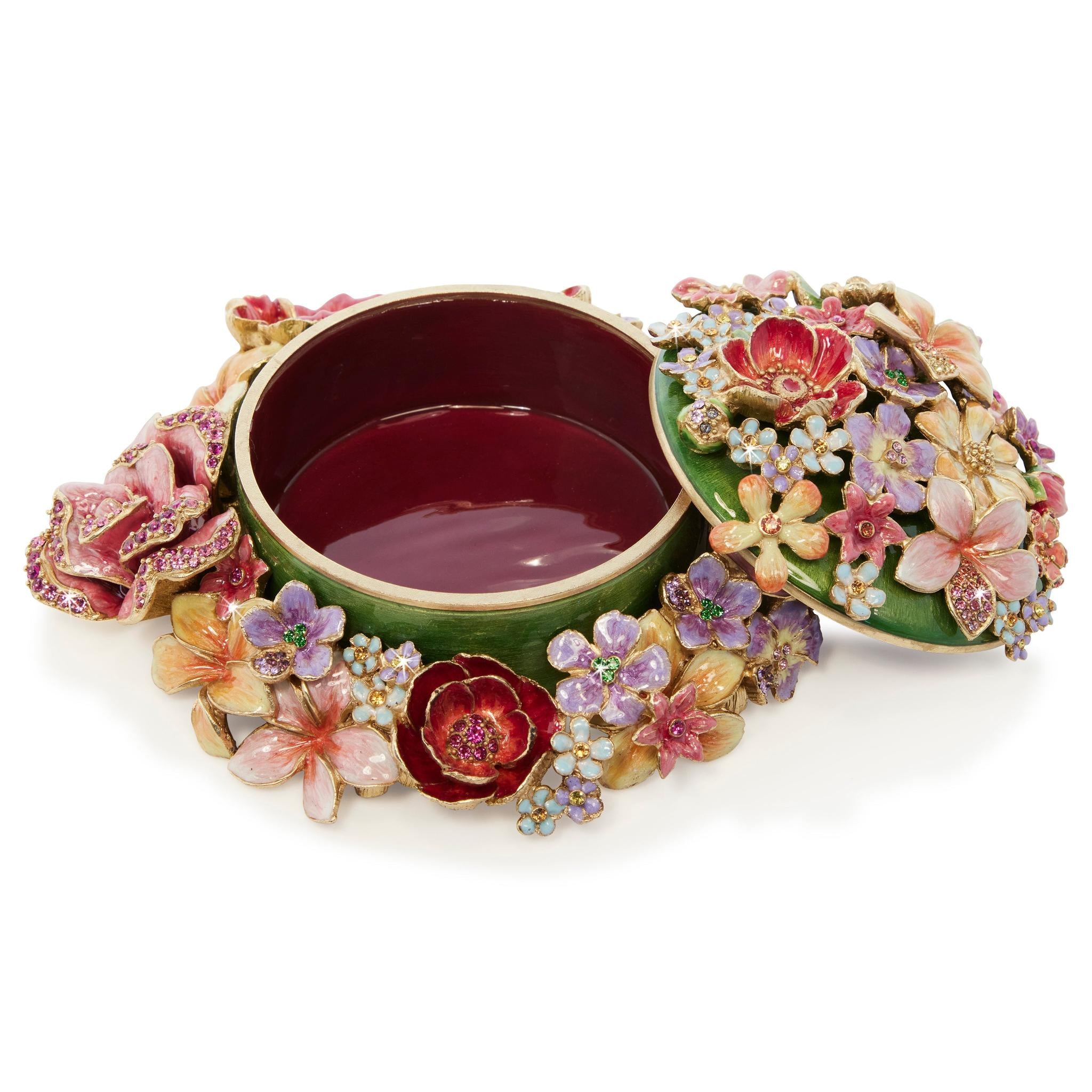 A rainbow of flowers cascades down and around the charming Ivy Bouquet Box. Fill with your treasures or gift to your loved ones. This box is hand enameled with stunning shades, plated in 14K gold and the sparkling crystals are meticulously handset on each flower's petals.