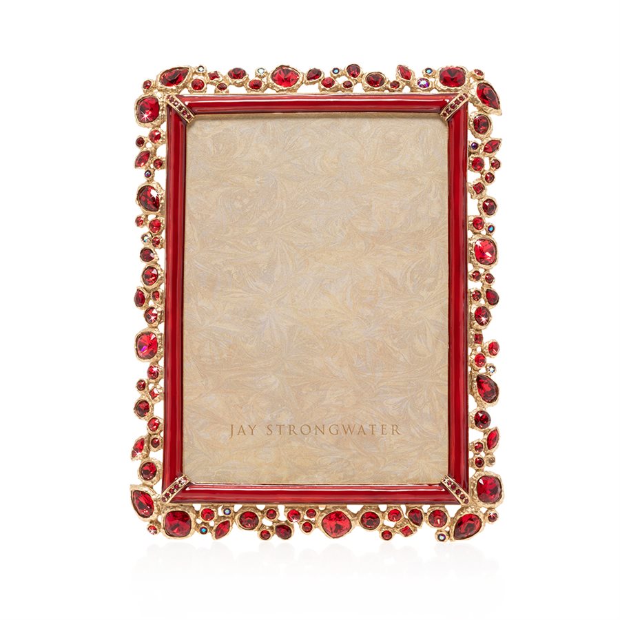 Surround your true love with a waterfall of Swarovski’s finest faceted large crystal stones in tones of Ruby, Scarlet and Siam wrapping around a slim enameled border. This Bejeweled Frame was casted in pewter, finished in 14K gold and beautifully painted in luminous ruby enamels by our finest artisans in Rhode Island. With our signature fleur-de-lis metal back plate and kickstand – this frame is truly beautiful from any view. Stands vertically or horizontal.
