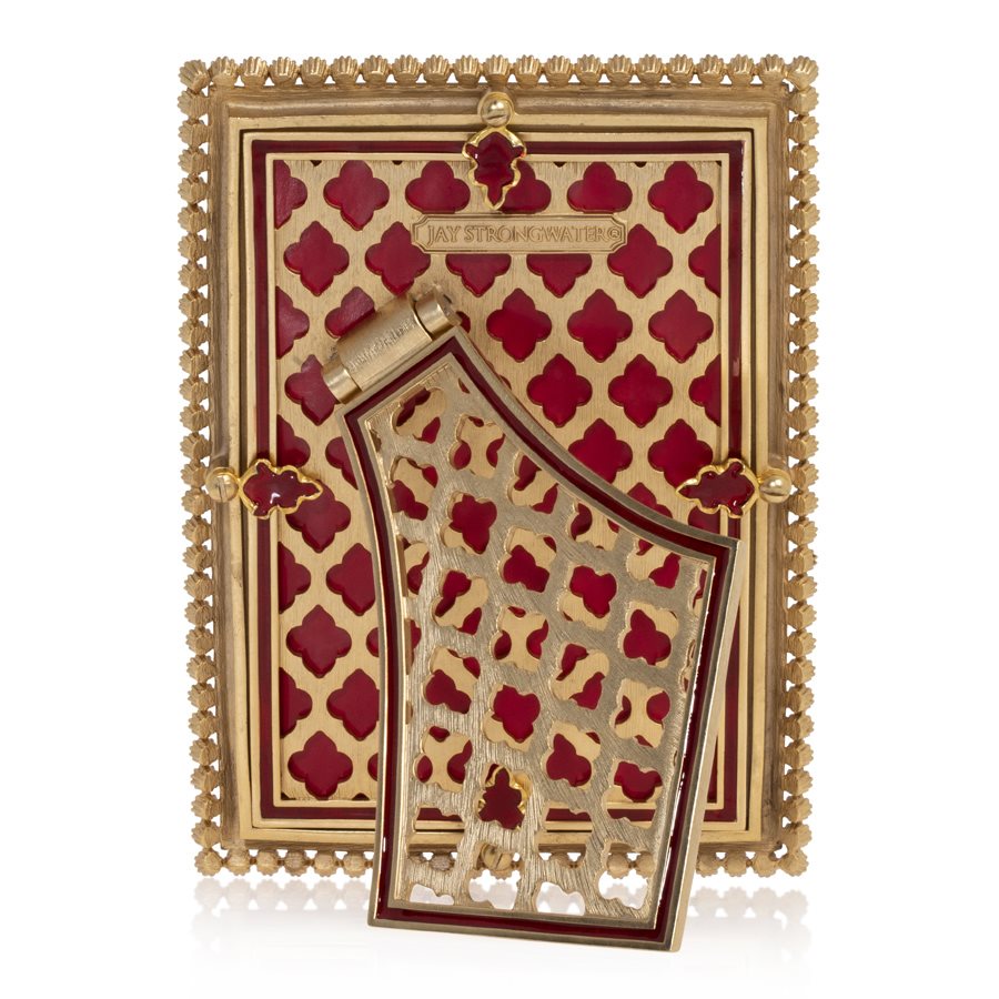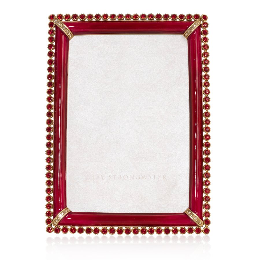Vibrant ruby red enamel as beautiful as an American Beauty Rose borders our classic Lorraine Stone Edge 4" x 6" Frame - the perfect way to frame your nearest and dearest. Our finest artisans at the Jay Strongwater Rhode Island workshop paint layers of enamel and hand-set sparkling Swarovski crystals along the border. All pewter metal frame finished in 14K gold with our signature fleur-de-lis metal back plate and kickstand "“ this frame is truly beautiful from any view. Frame stands vertically or horizontally.